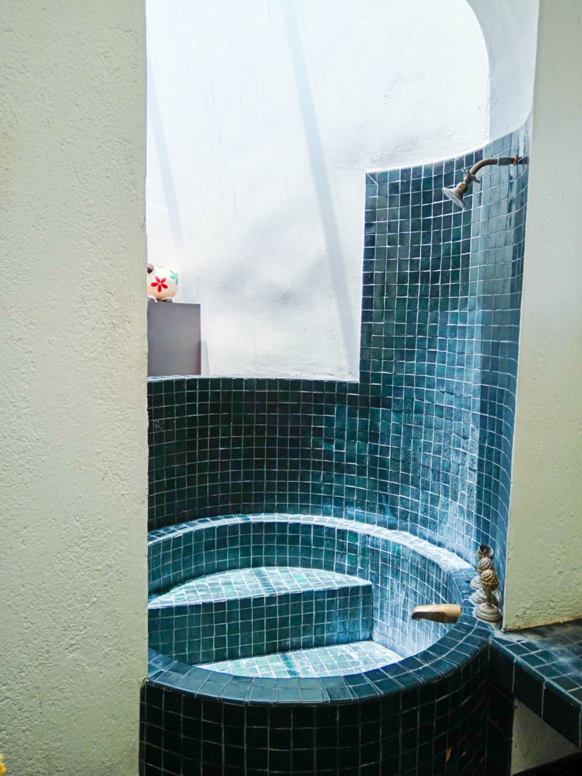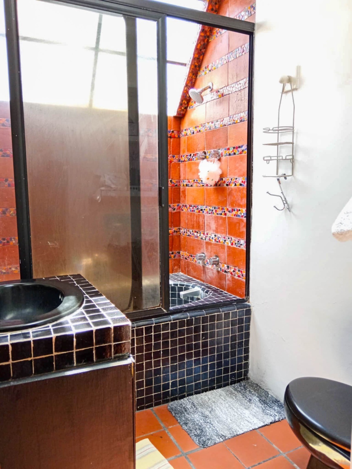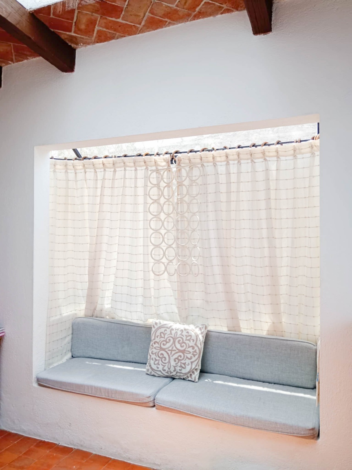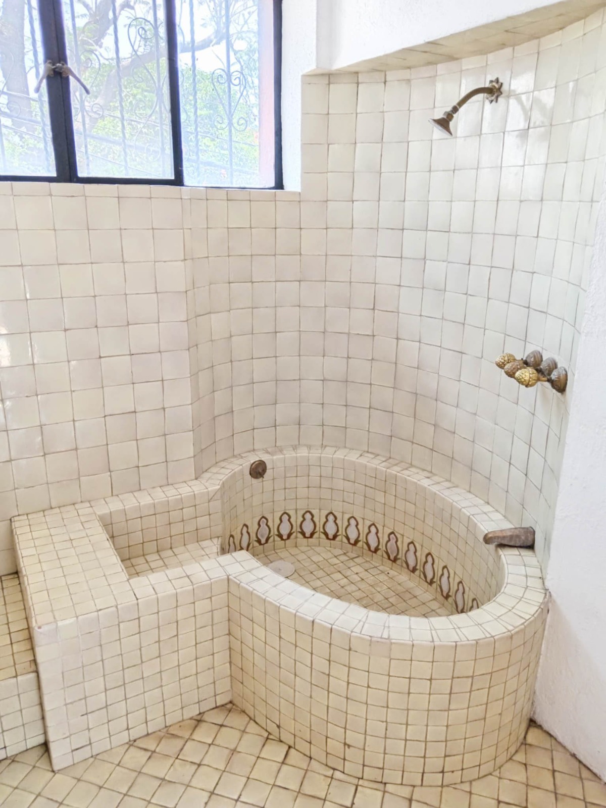 Nela temos uma sala e uma sala de jantar, ambas com lareira e uma cozinha mexicana; dois quartos, o Master com banheiro completo, banheira e closet. Além disso, há outro banheiro completo, também com banheira. Depois, o jardim, com área de grama e árvores, distribuído em dois terraços.