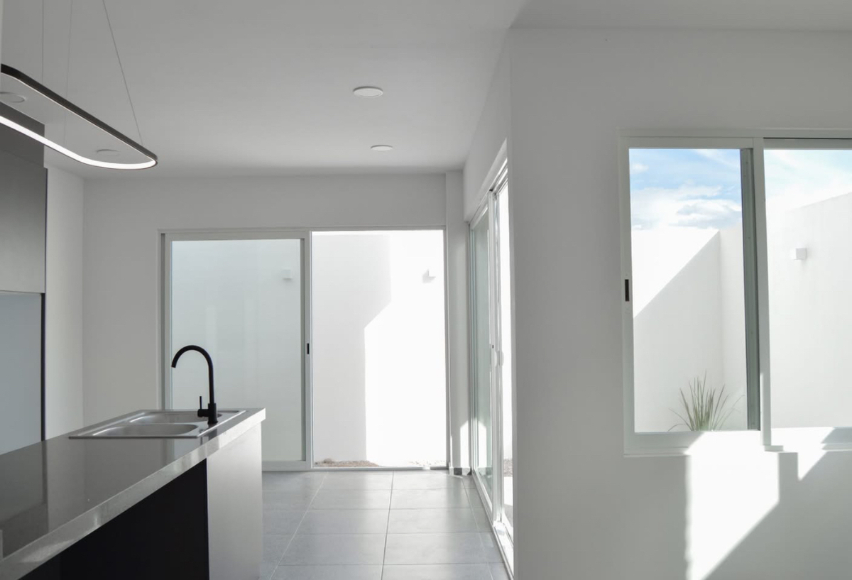 Casa de 120 m2, diseñada para mantener una temperatura de confort,con orientación solar y ventilación cruzada , Fachada e interiores contemporáneos, interiores privados pero a la vez abiertos ,materiales de alta calidad, cocina y closets, cocina de alta calidad.