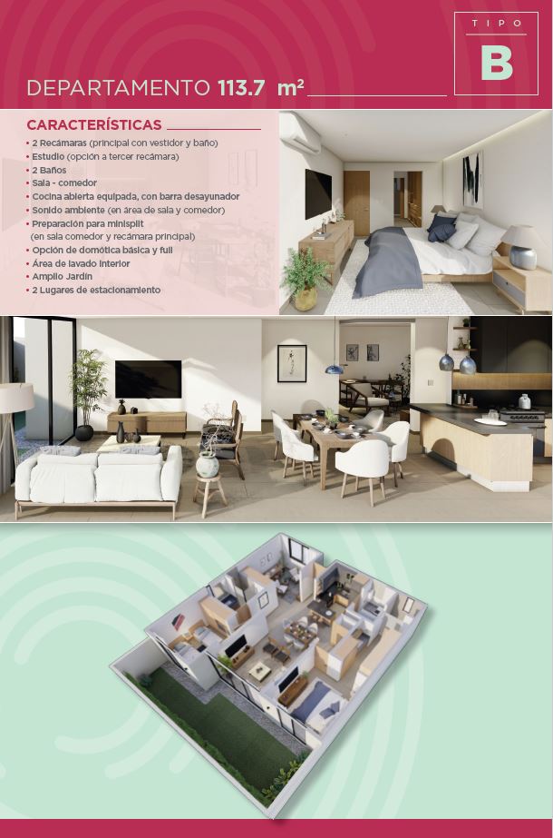 Departamento de 2 recámaras (principal con vestidor baño) Estudio (opción 3a recámara). 2 baños. Sala/Comedor Cocina abierta equipada con barra desayunador. Sonido ambiental en área de sala y comedor. Preparación para mini split en Sala/Comedor y recámara principal. Opción de domótica (básica y full). Área de lavado interior. Amplio Jardín Dos Cajones de Estacionamiento.