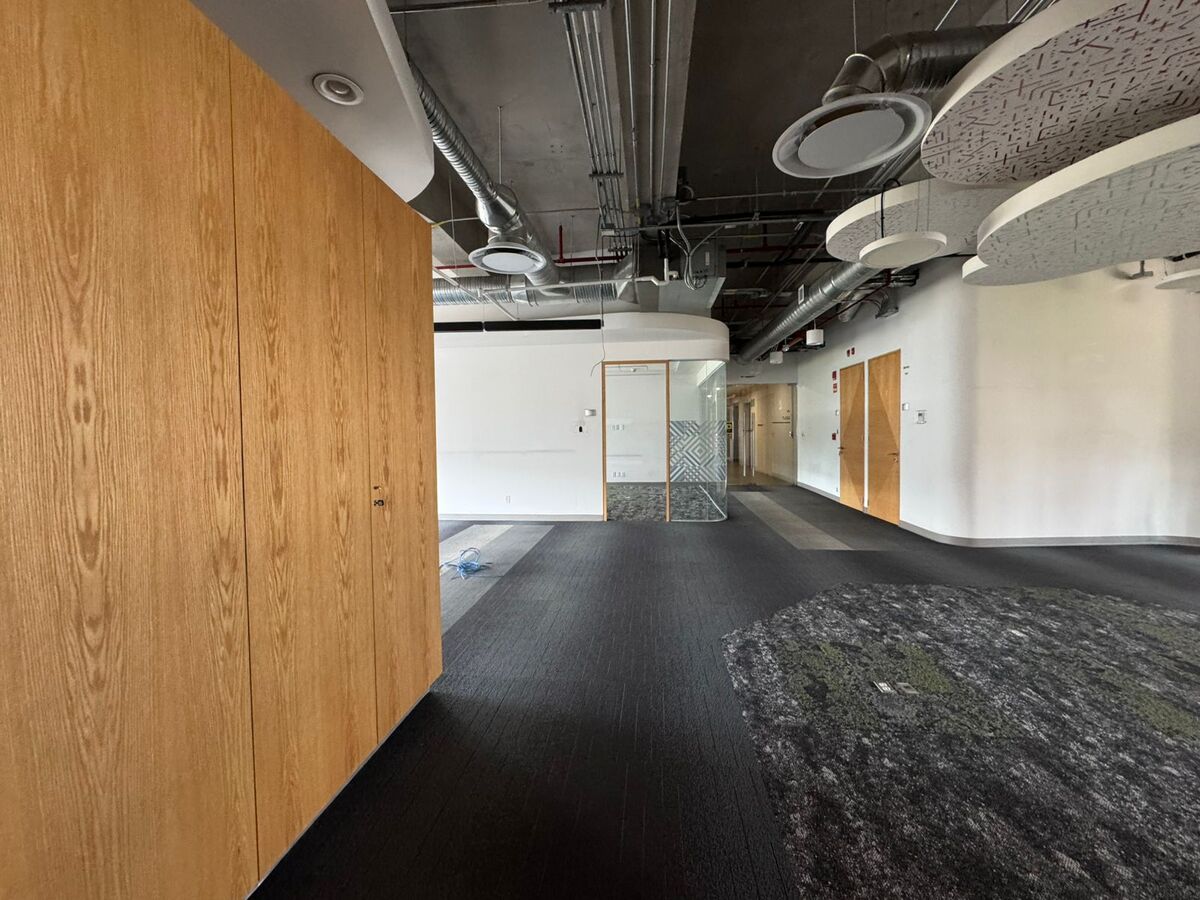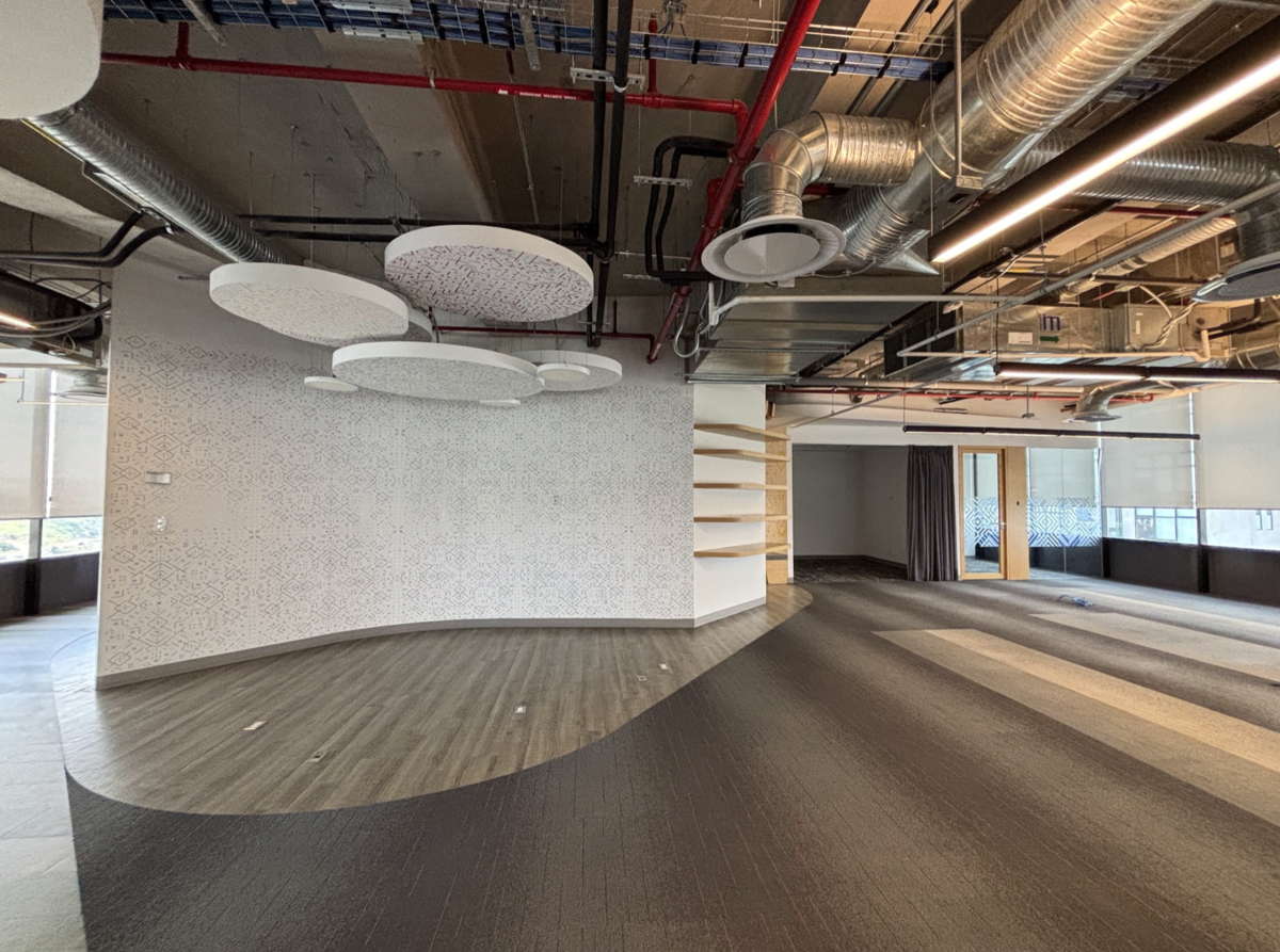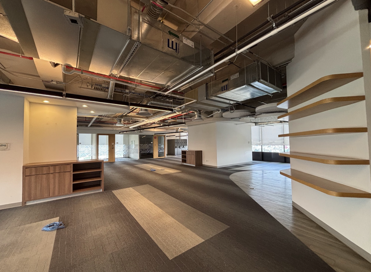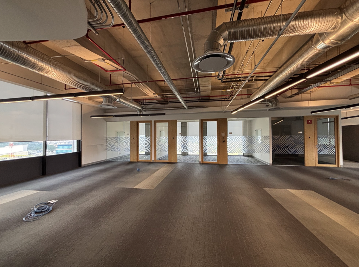 Sin amueblar, pero sí totalmente acondicionada con alfombras, pisos, salas de juntas, divisiones, área de descanso y zona para el site con anaqueles listos para comenzar a operar.