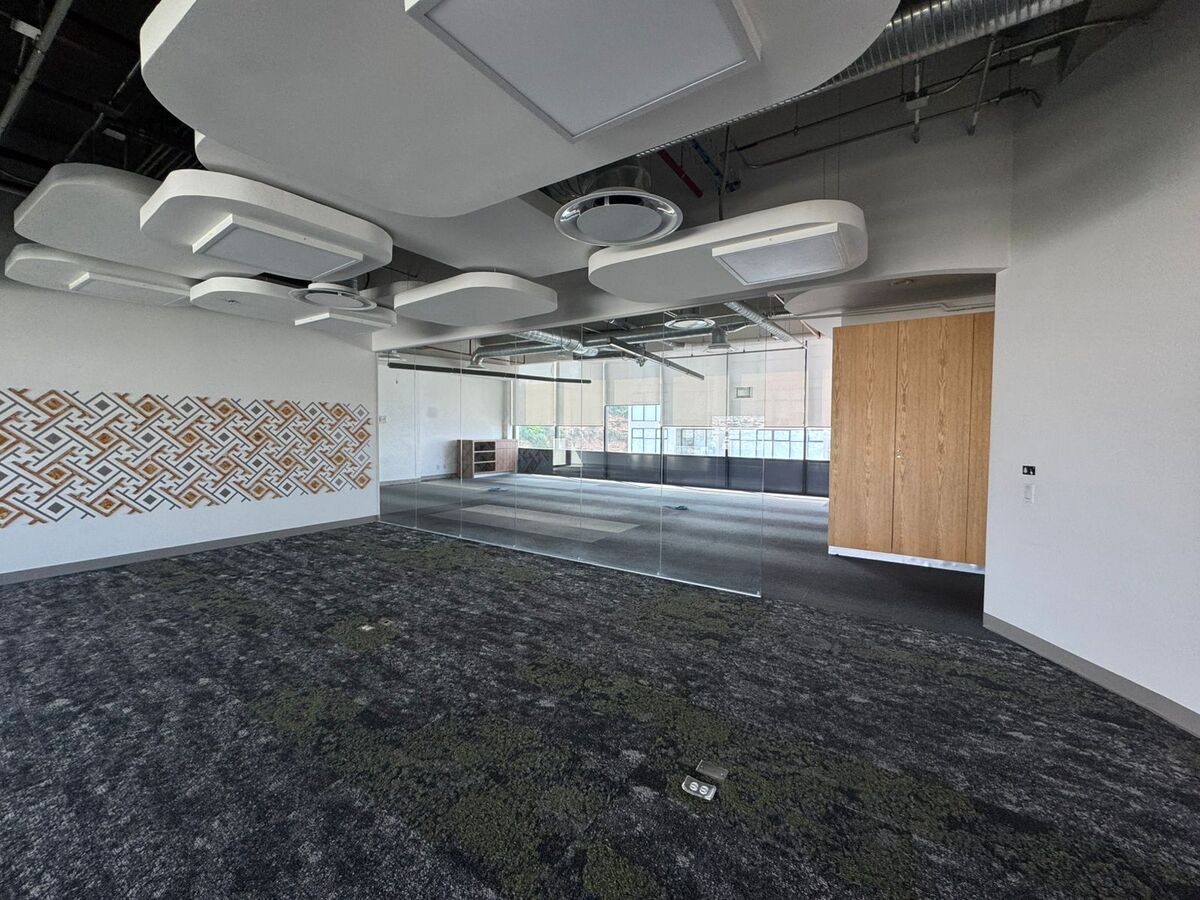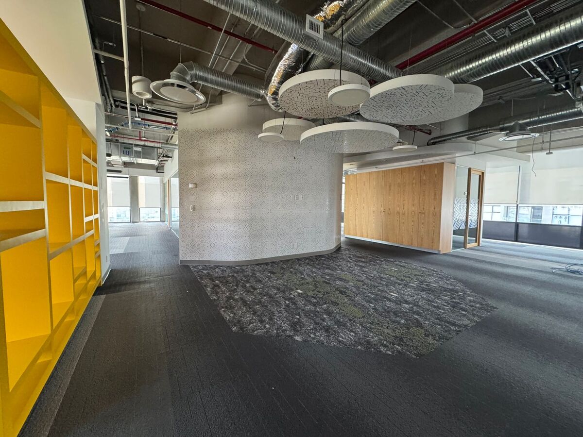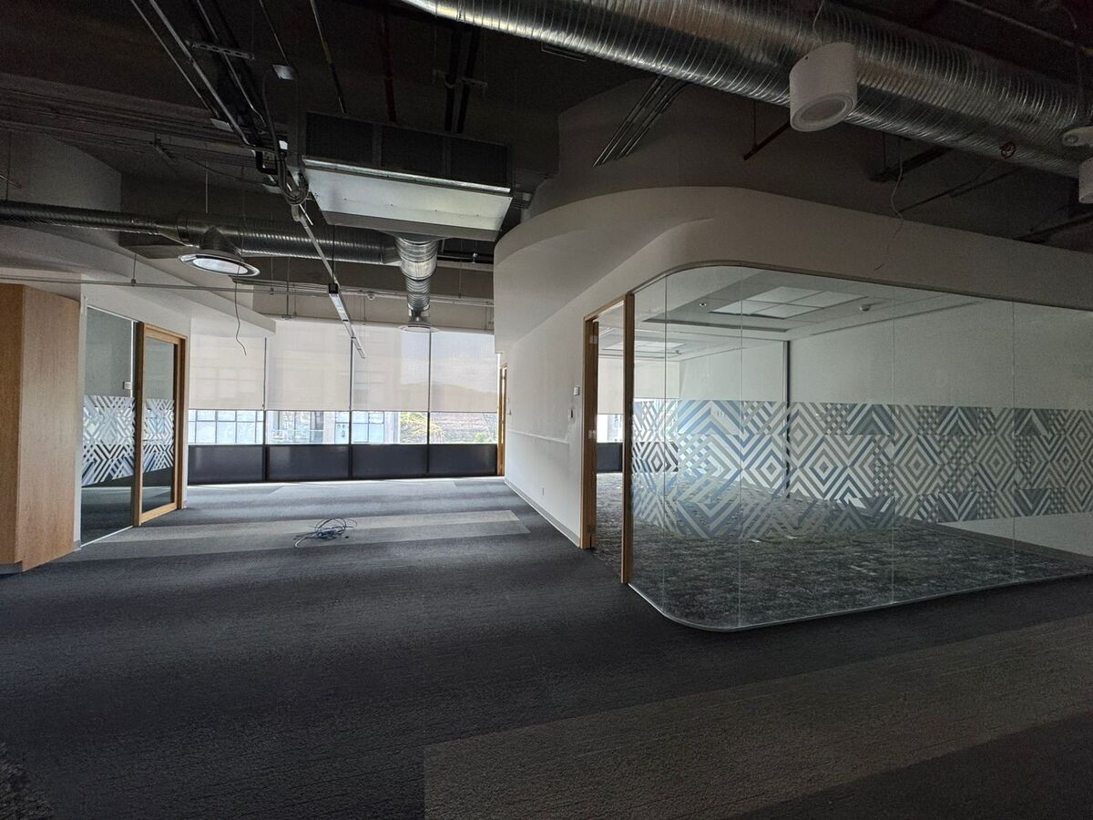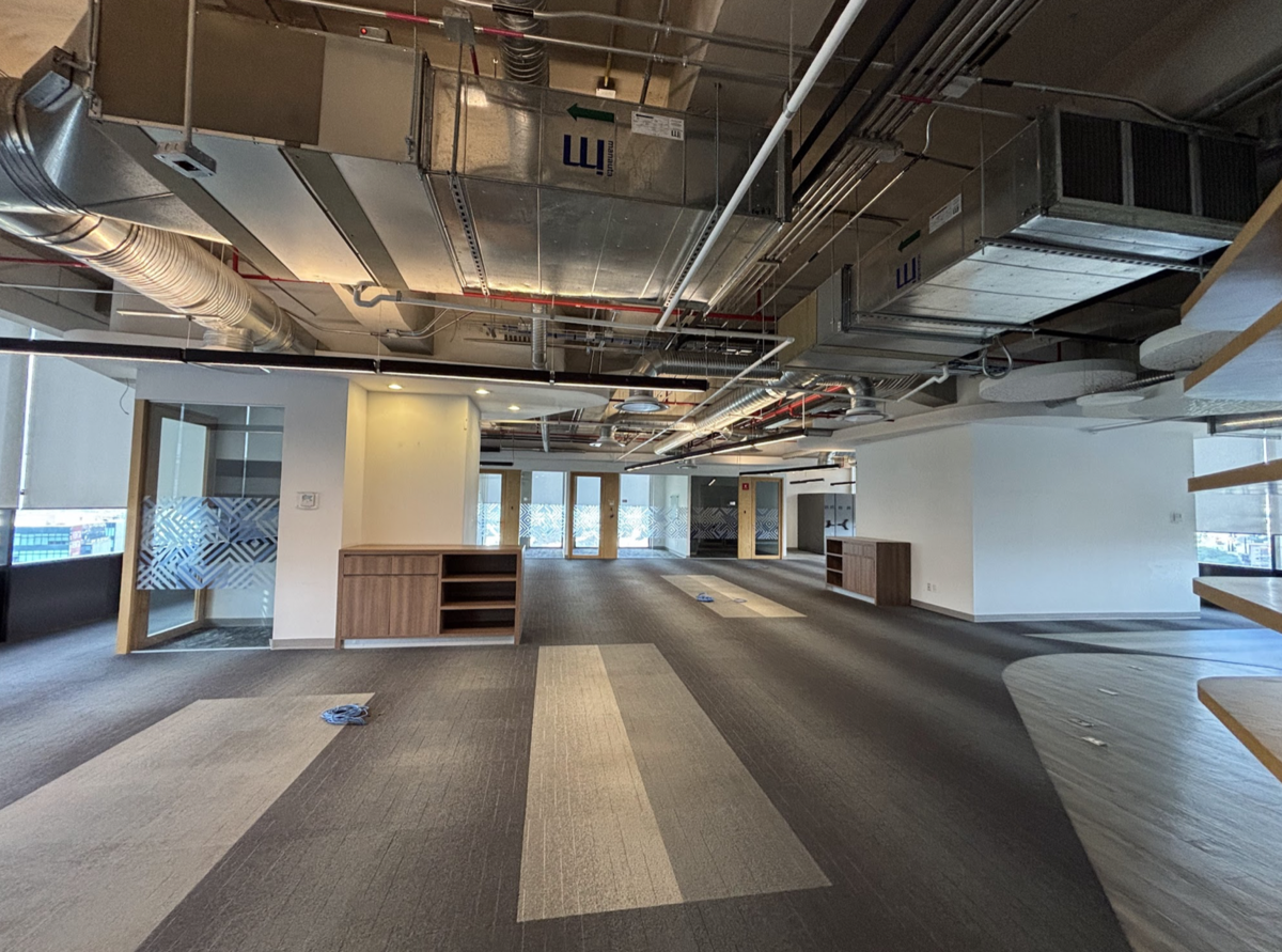 Sin amueblar, pero sí totalmente acondicionada con alfombras, pisos, salas de juntas, divisiones, área de descanso y zona para el site con anaqueles listos para comenzar a operar.