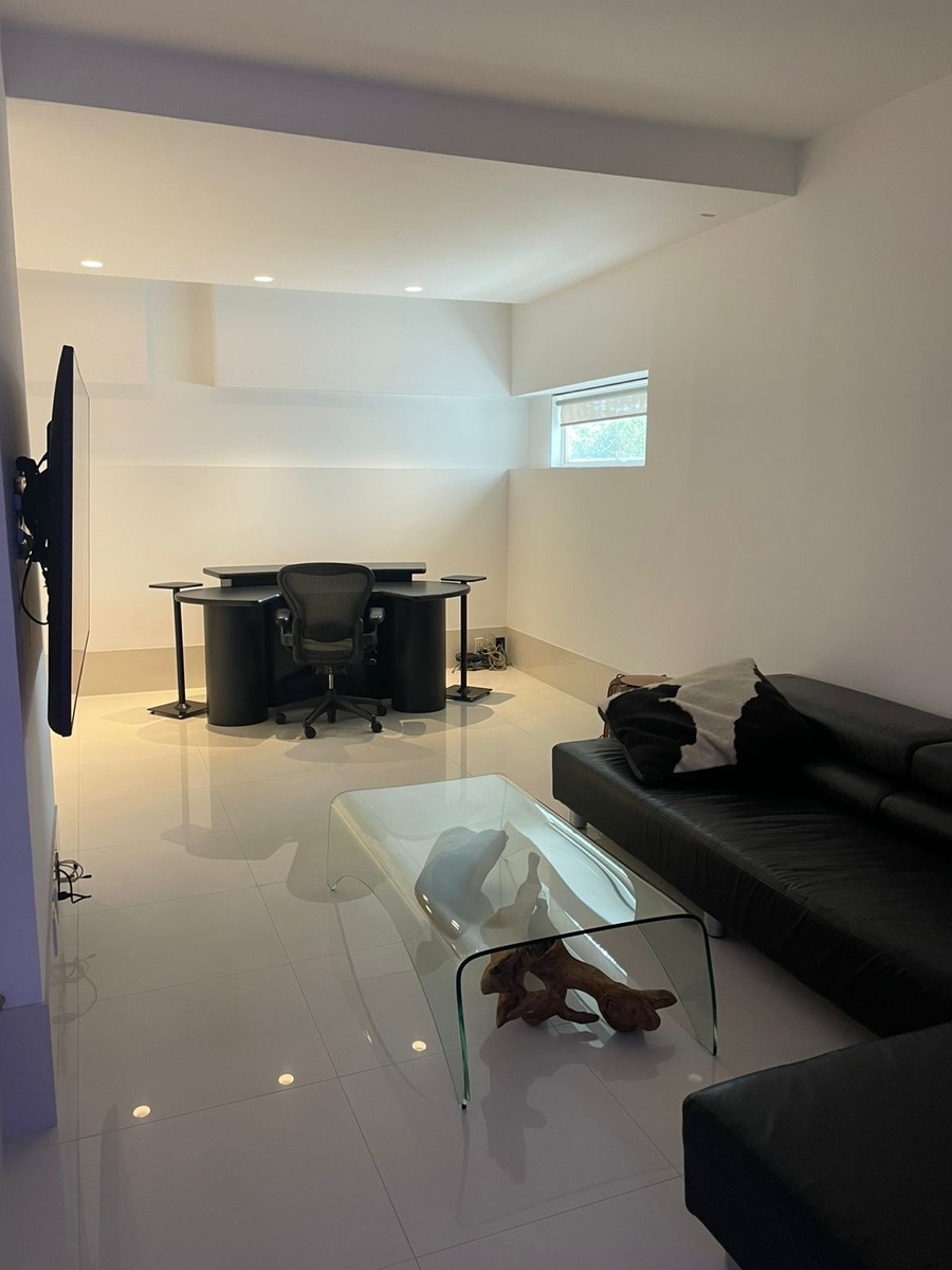- No térreo, há um amplo escritório que pode ser subdividido. Tem um salão com teto de tripla altura que pode ser usado para eventos ou apresentações, e também possui banheiros masculinos e femininos.