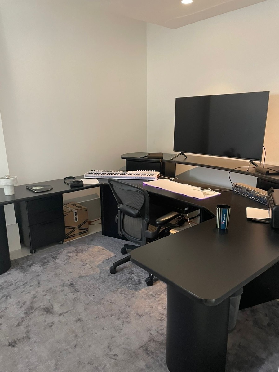 - No térreo, há a recepção, um banheiro masculino e um feminino, dois escritórios privados muito amplos e a sala de reuniões.