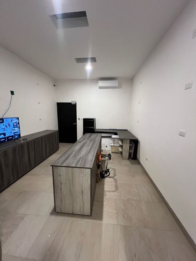 • El mobiliario de oficina que se aprecia en las fotografías (escritorios, pantalla led, frigobar y dispensador de agua