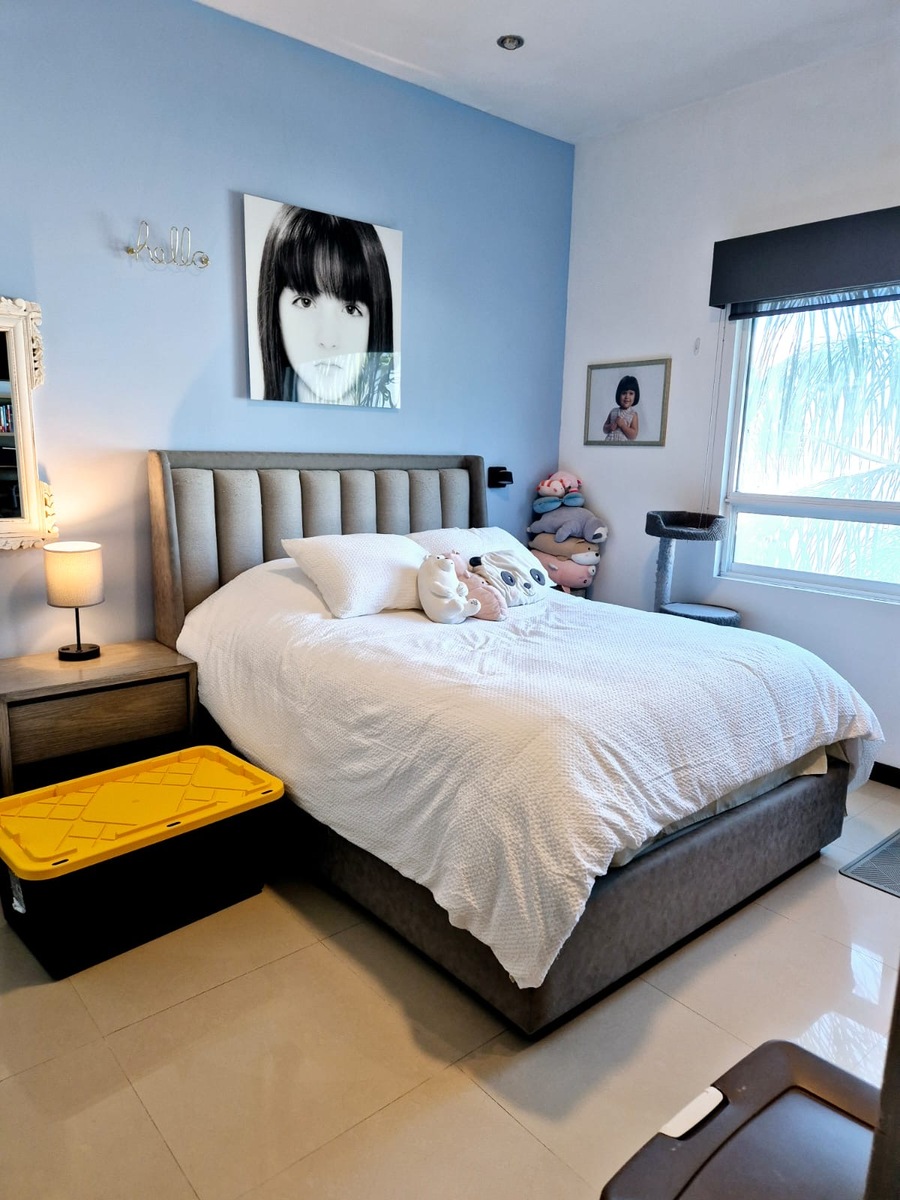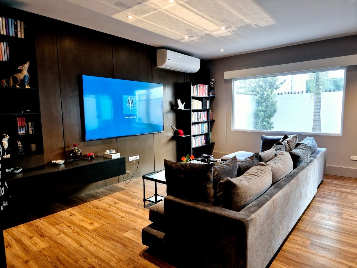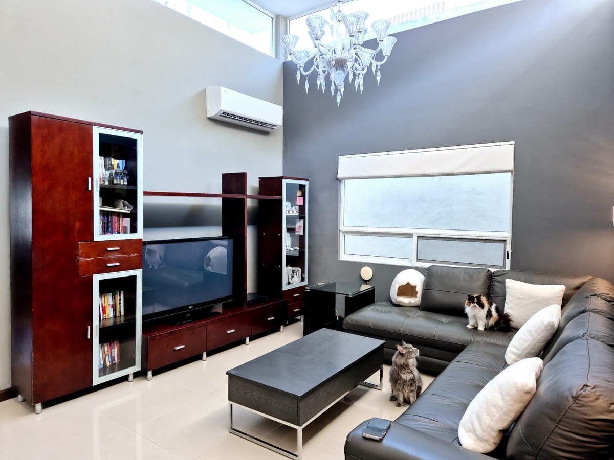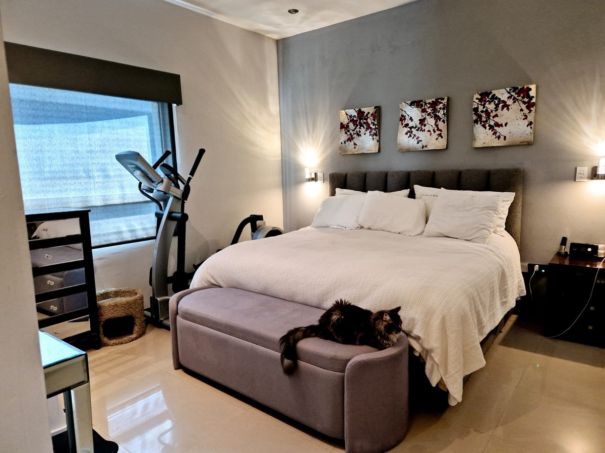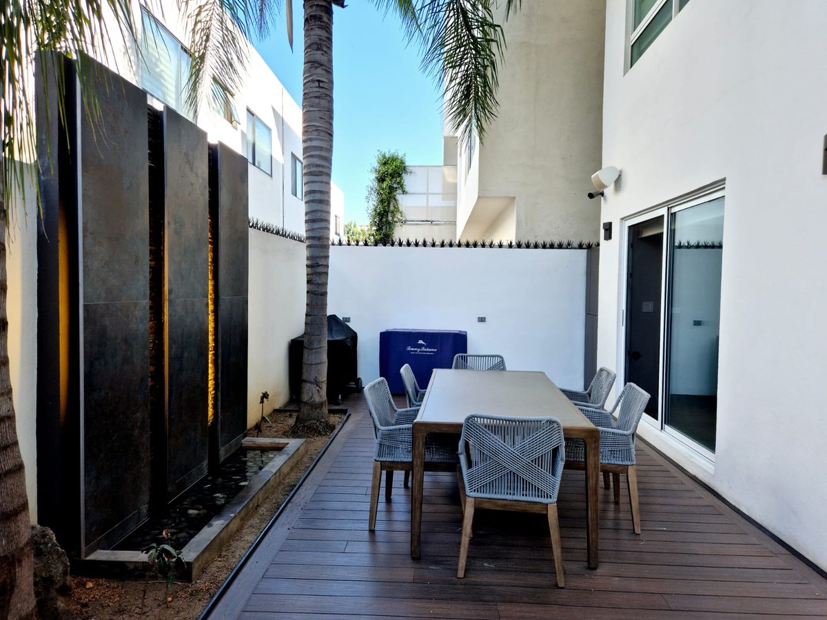 Paneles solares, minisplits, abanicos de techo, cocina equipada con refrigerador, estufa, horno y lavavajillas, muebles de madera, cuadro decorativo, cámaras de seguridad.
