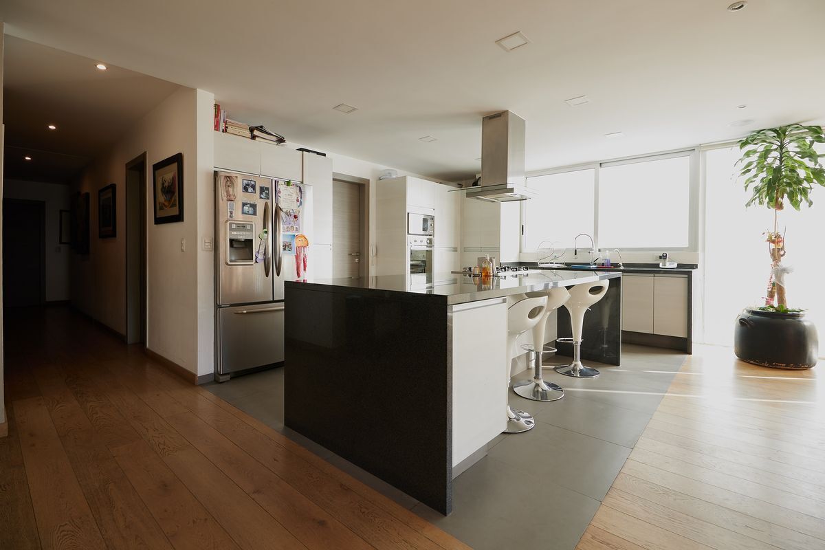 Sala, comedor y balcón, cocina abierta con Isla en granito amplia, cuarto de servicio con baño completo y cuarto de Lavado, además de 3 cajones de estacionamiento totalemente independientes.