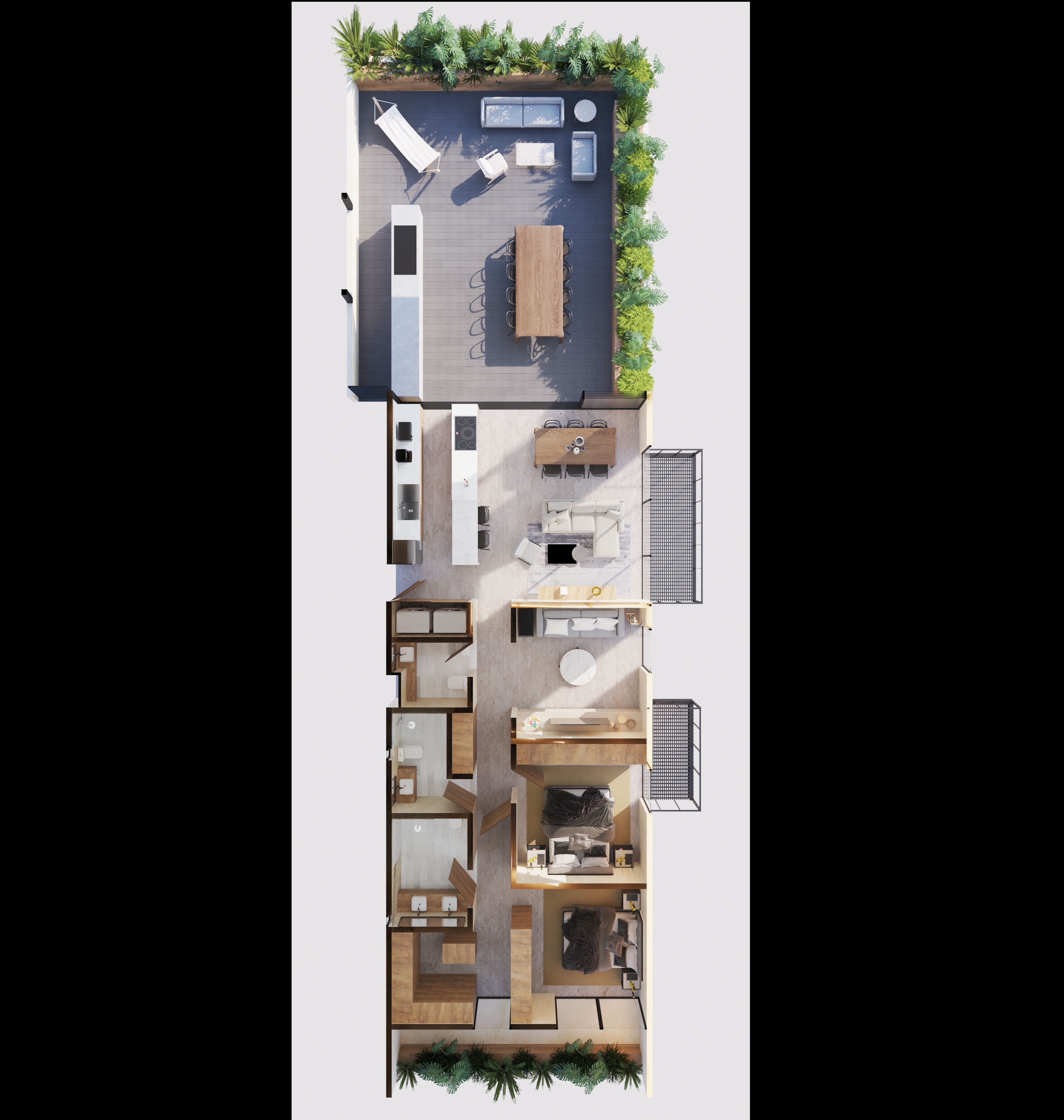 -Terrazas (una de 76.73 m2 y otra de 4.56 m2), proporcionando una transición armoniosa entre el interior y el exterior del departamento.