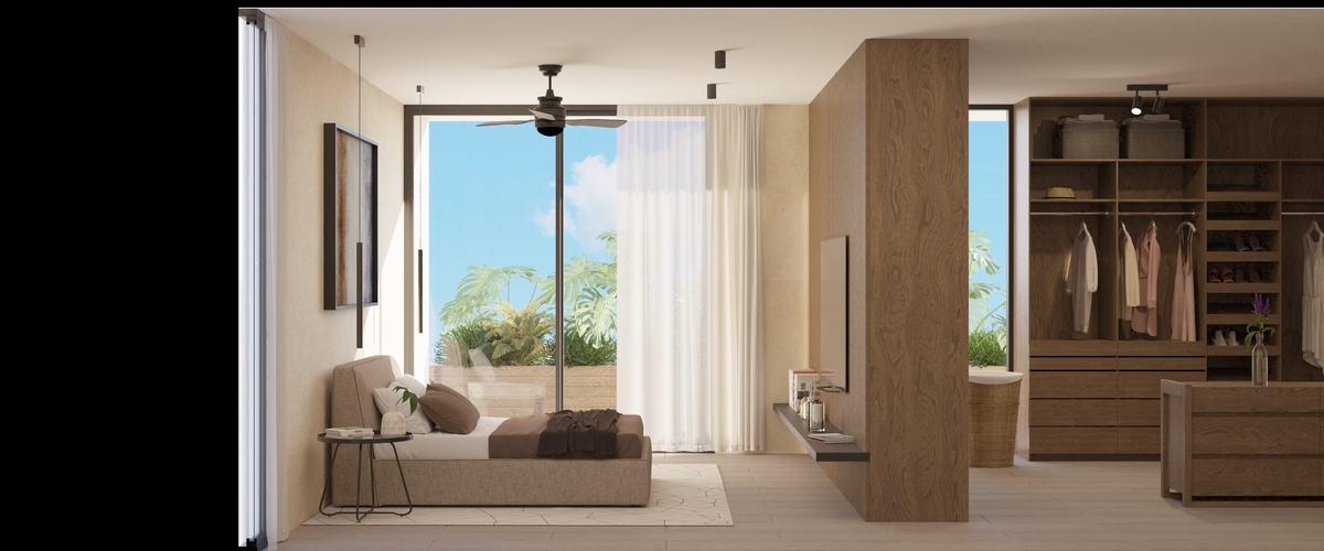 -1 recámara principal con closet vestidor (26.20 m2), baño principal (6.70 m2) equipado con muebles de alta calidad: WC (American Standard o similar en calidad/precio), lavabo y monomando (URREA o similar en calidad/precio) y terraza (12.69 m2).