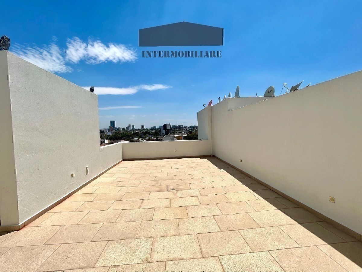 Con 266 m, ubicado junto al Parque Colomos. Este elegante departamento de dos plantas cuenta con sala, comedor, cocina, 2 recámaras con baño completo en planta baja, y en la planta alta, una recámara principal con vestidor y baño completo. Además, incluye roof garden, cuarto de servicio con baño completo y área de lavado. Dos terrazas, una frente a la recámara principal y un amplio roof garden, brindan espacios al aire libre.