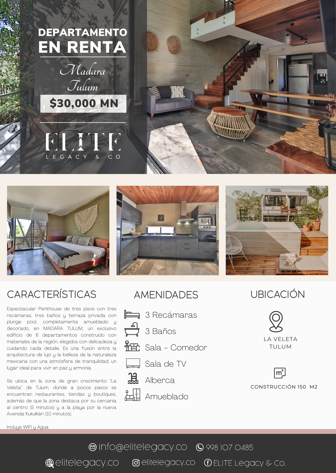 Espectacular Penthouse de tres pisos con tres recámaras, tres baños y terraza privada con plunge pool, completamente amueblado y decorado, en MADARA TULUM, un exclusivo edificio de 6 departamentos construido con materiales de la región, elegidos con delicadeza y cuidando cada detalle. Es una fusión entre la arquitectura de lujo y la belleza de la naturaleza mexicana con una atmósfera de tranquilidad, un lugar ideal para vivir en paz y armonía.