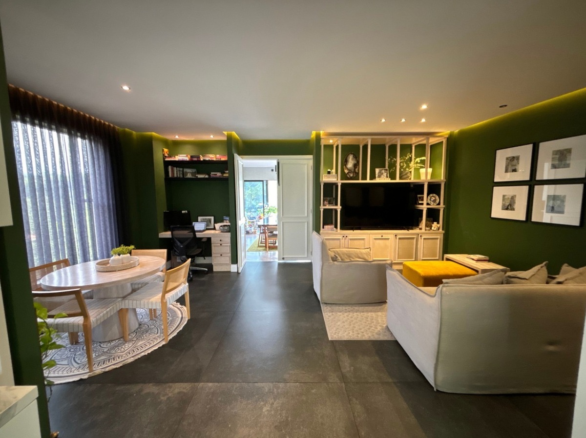 O primeiro andar consiste em sala de estar e jantar com um terraço, banheiro de visitas, sala de família, cozinha e área de café da manhã, quarto com closet e banheiro, quarto de serviço, lavanderia.