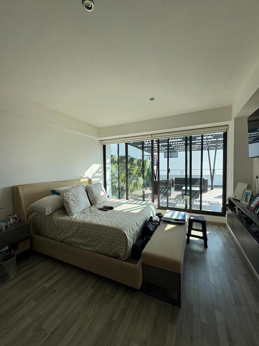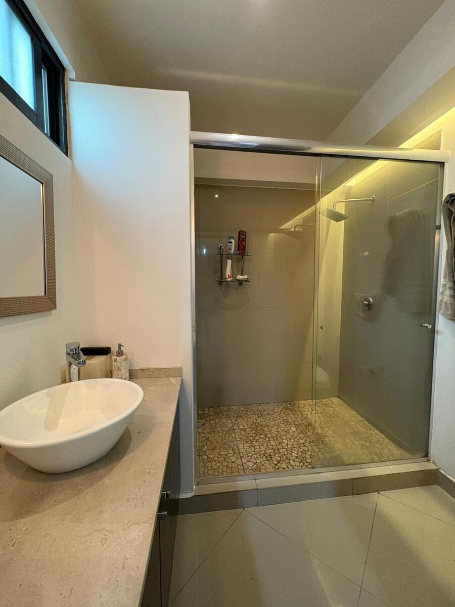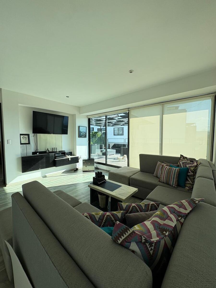 3 recámaras con baño, 2 con vestidor y una con clóset, Sala comedor, medio baño de visitas, cocina integral equipada, barra desayunadora, sala de TV, balcón en planta baja y terraza amplia en planta alta; estacionamiento para 3 autos.