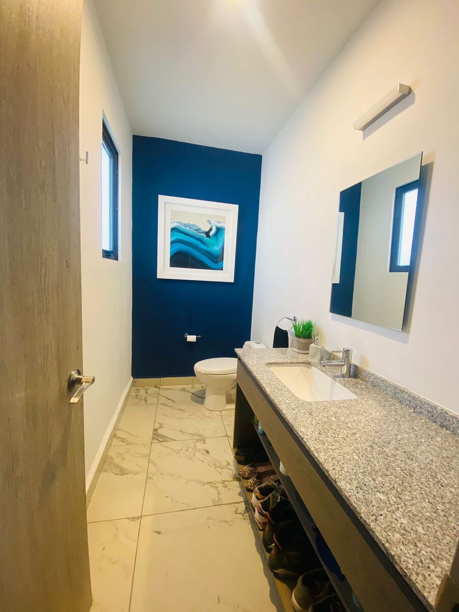 La primera planta cuenta con una hermosa cocina abierta con isla conectada a un amplio comedor con doble altura y sala de estar con ventanales. Aquí podrás salir al patio trasero y disfrutar de su jacuzzi. También cuenta con área para centro de lavado y medio baño de visitas.
