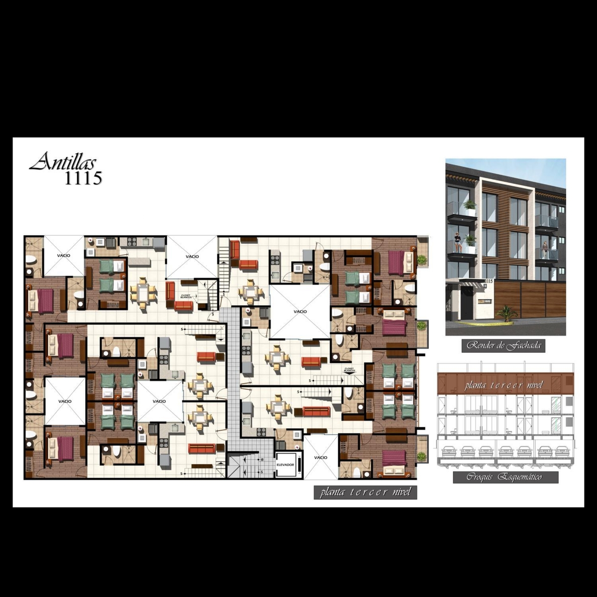 18 departamentos, edificio de 3 niveles con 6 departamentos por piso .