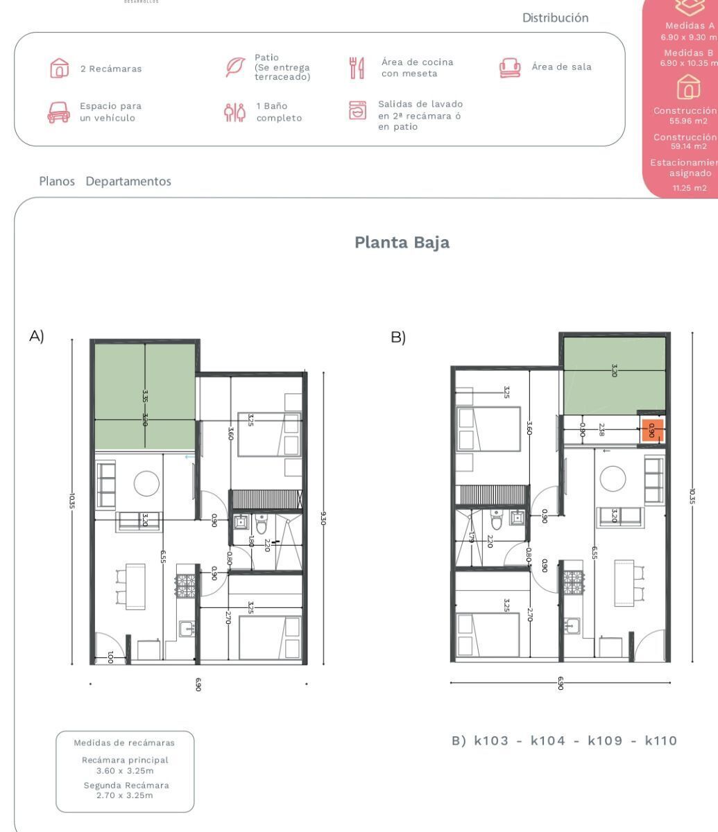 MEDIDAS B , 6.90 M X 10.35 M , Construcción 59.14m.
