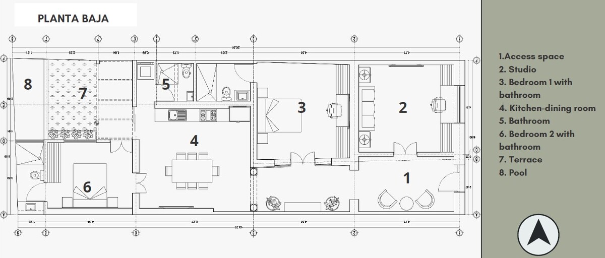 La casa se distribuye en una sola planta y en su remodelación se ha cuidado respetar la esencia del estilo colonial que se aprecia en pisos y techos, dando un toque moderno que armoniza con los acabados característicos de la región.