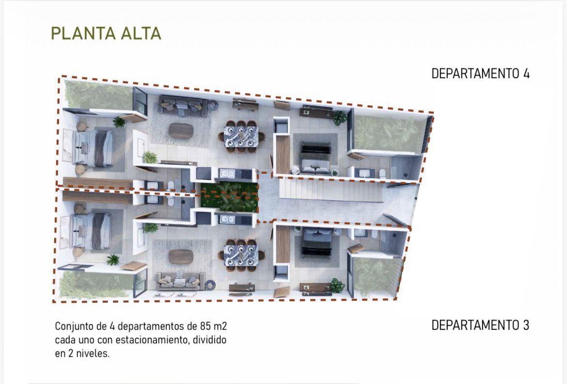 Cada departamento cuenta con 85m2 distribuidos de la siguiente manera: