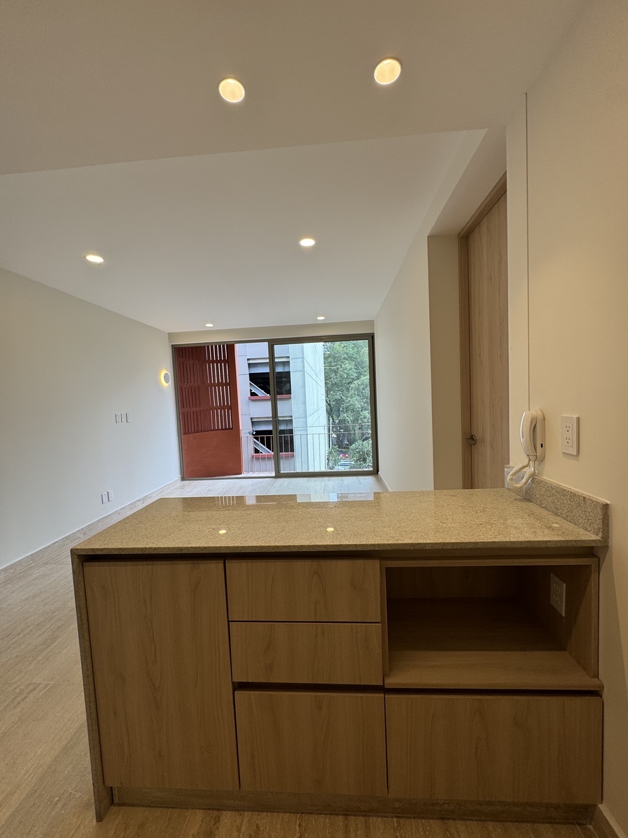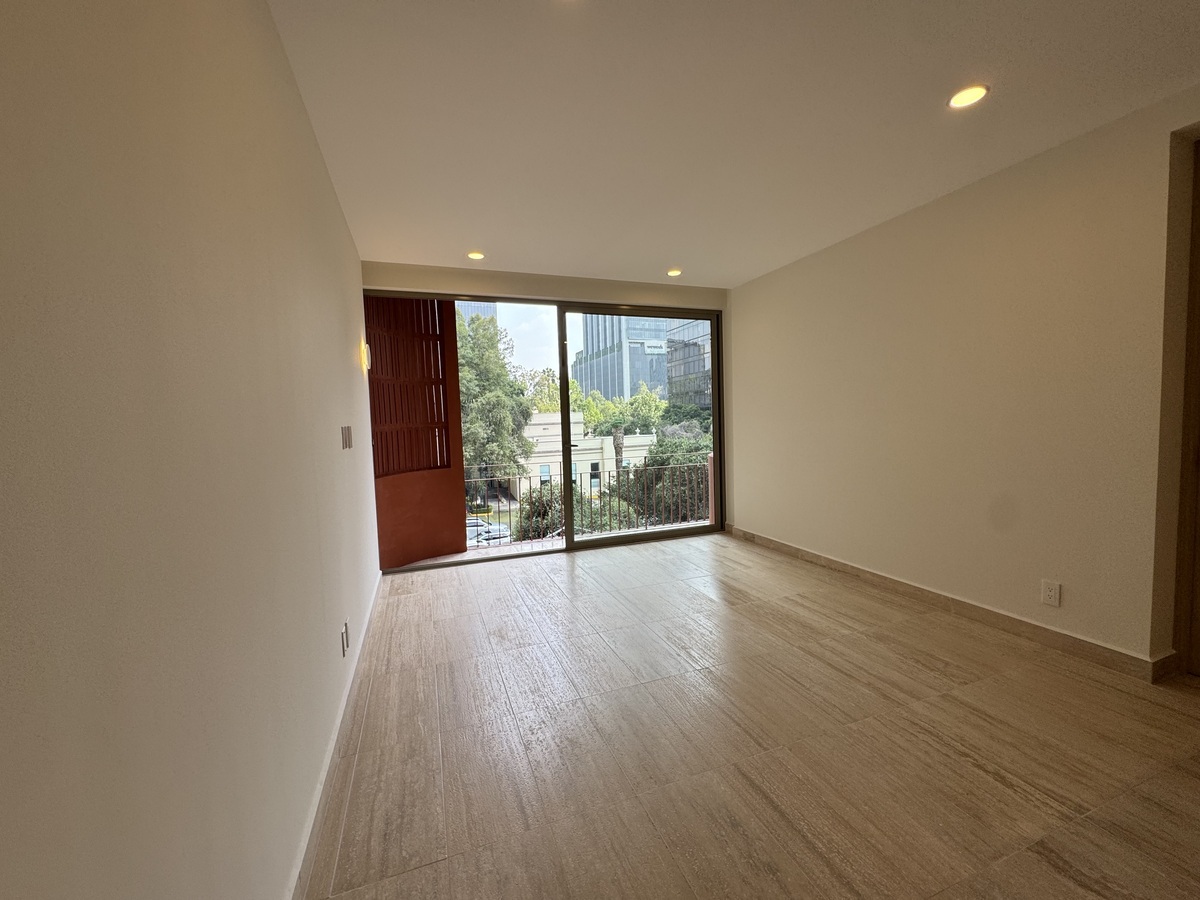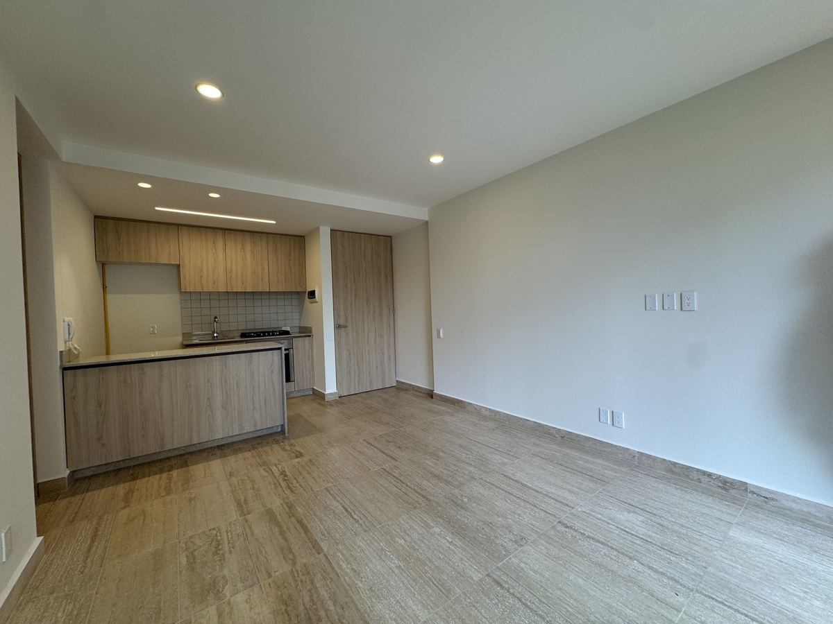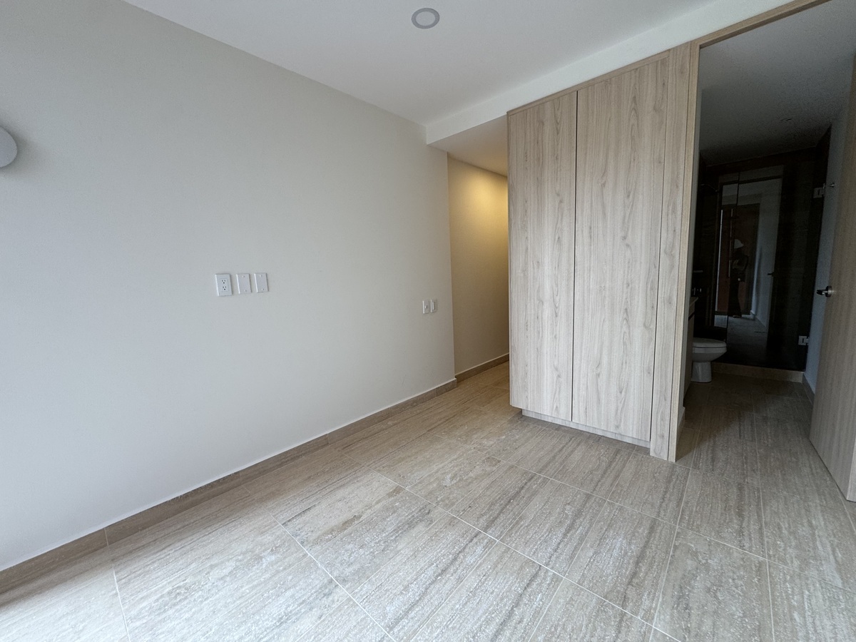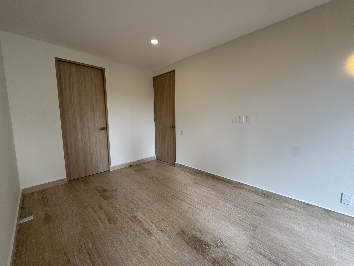 75 m2, 2 recamaras, 11 m2 de terraza, estancia, comedor, cocina, recámara principal con walking–closet y baño, recámara secundaria baño, cocineta, acceso directo.