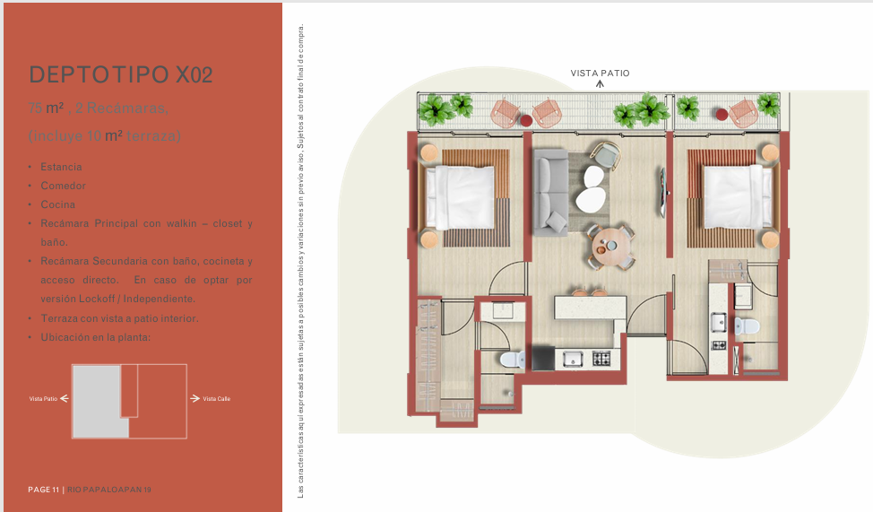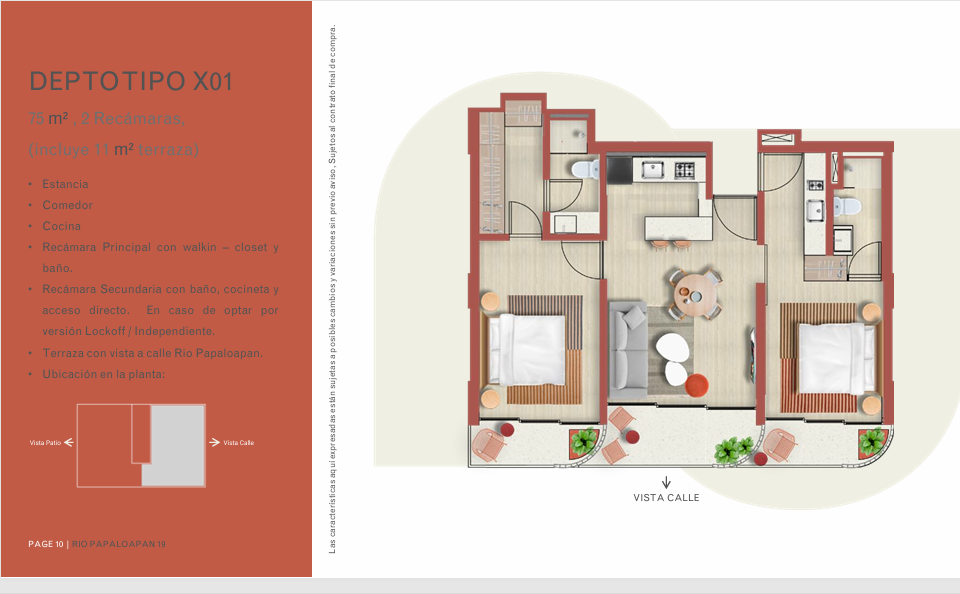 75 m²,2 recámaras,10 m² terraza, estancia, comedor, cocina, recámara Principal con walking–closet y baño, recámara secundaria con baño, cocineta, acceso directo. En caso de optar por versión Lockoff/Independiente.