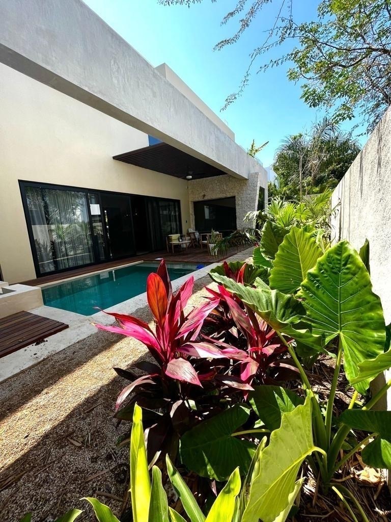Jardín posterior integrado a la zona de la alberca con acceso desde el area social