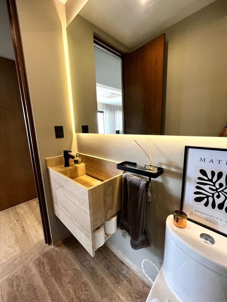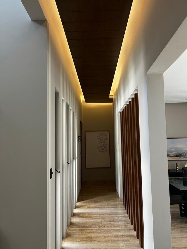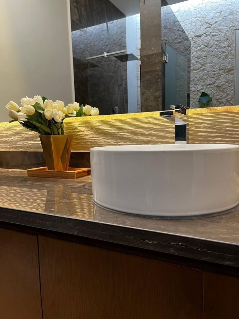 Quarto amplo com vestiário, banheiro completo com pias duplas, chuveiro. Espelho flutuante com luz indireta.