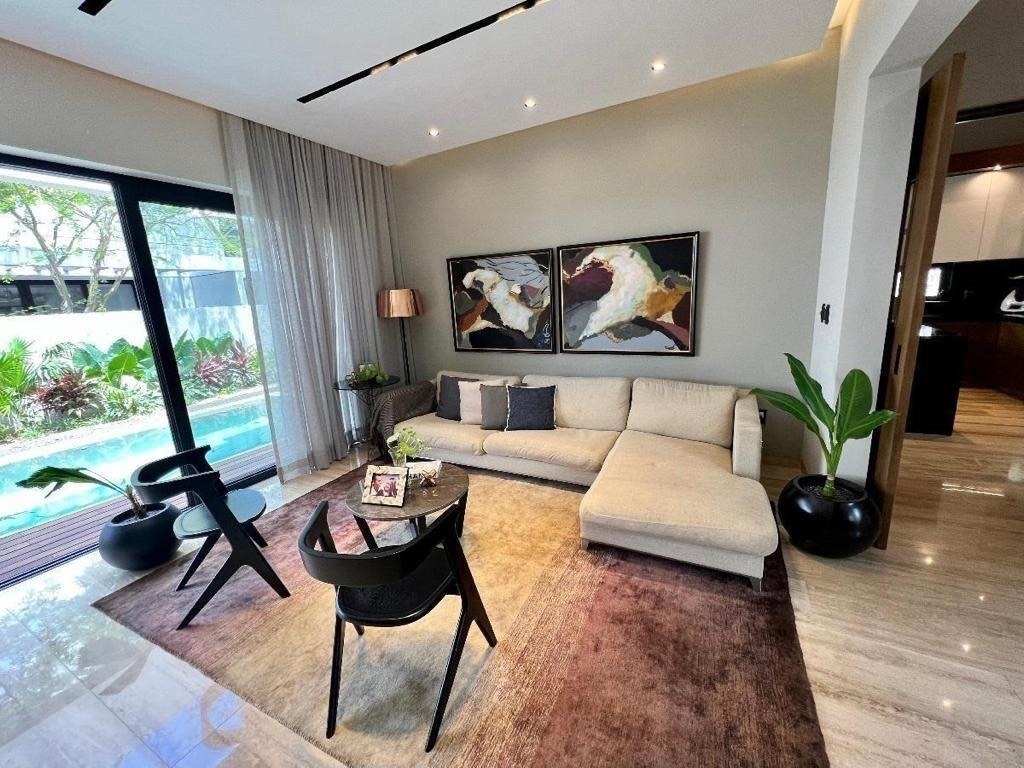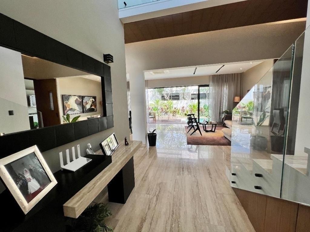 Area con doble altura con ventanales vista a la alberca. Revestimientos y acabados de lujo