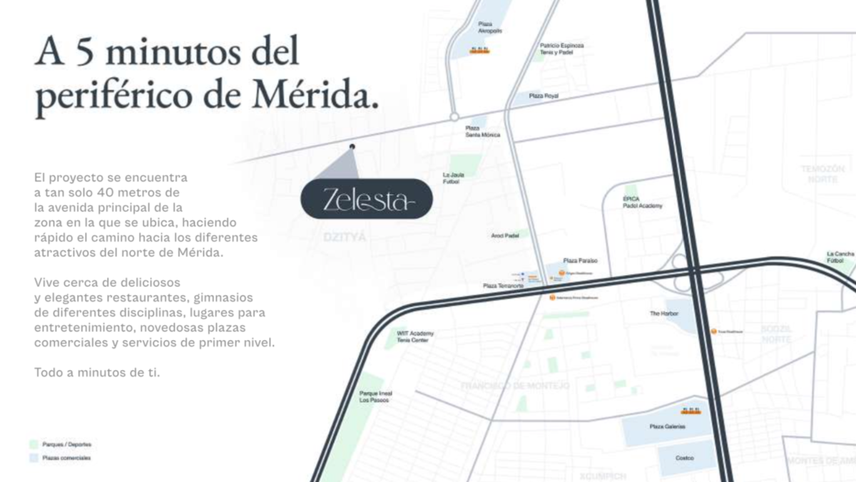 Ubicado en Dzityá, a tan solo 40 metros de la avenida principal, Zelesta ofrece un entorno de privacidad y exclusividad con fácil acceso a toda la ciudad a través del periférico. Disfruta de la comodidad de tener restaurantes, plazas comerciales y lugares de entretenimiento a solo minutos de tu hogar.