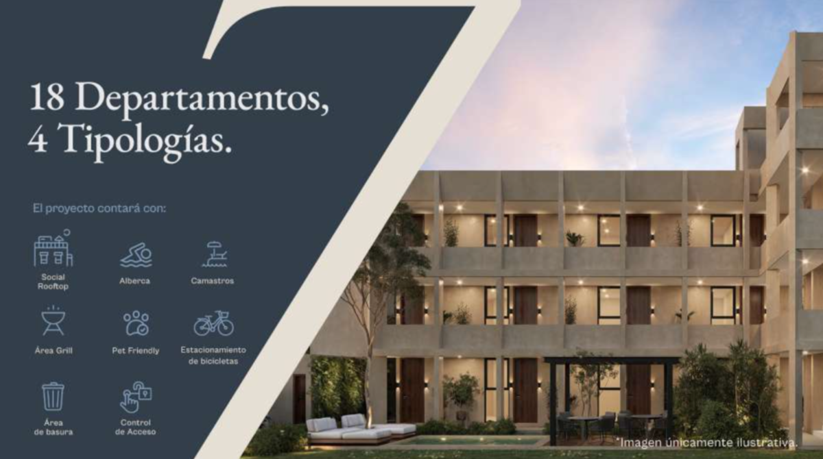 Amenidades como roof top con mobiliario, alberca con acabado chukum y área grill complementan la experiencia.