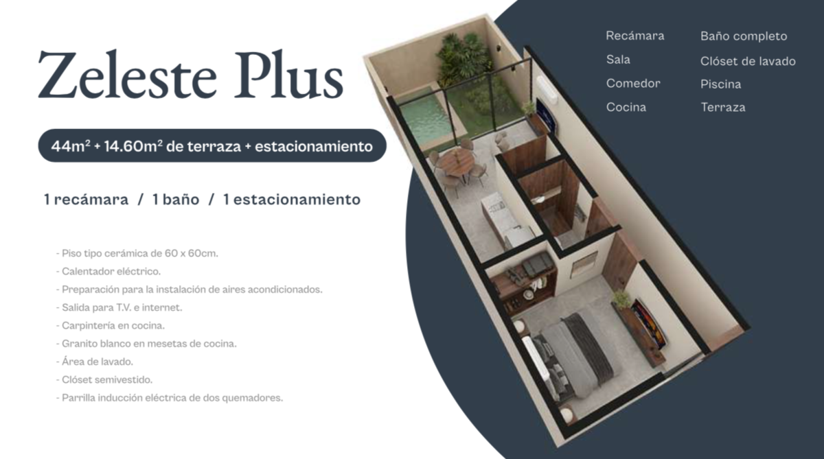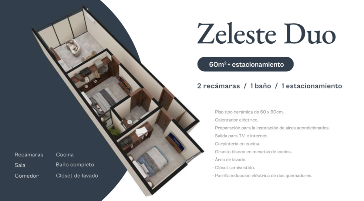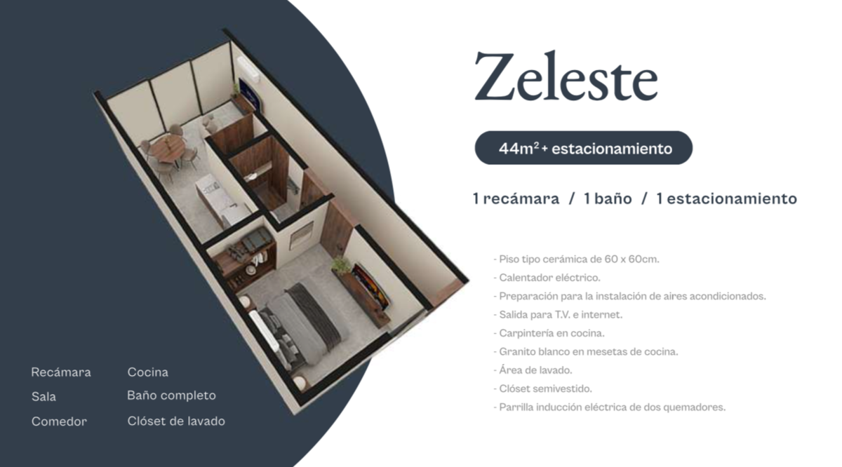 Con solo 18 departamentos y cuatro modelos a elegir, Zelesta es ideal para quienes buscan un espacio único y bien equipado. Todos los departamentos incluyen carpintería en cocina, closets semivestidos, mesetas de granito, calentador eléctrico y parrilla de inducción.