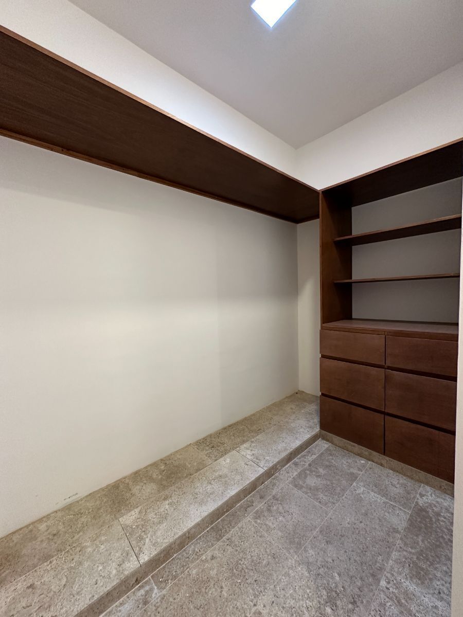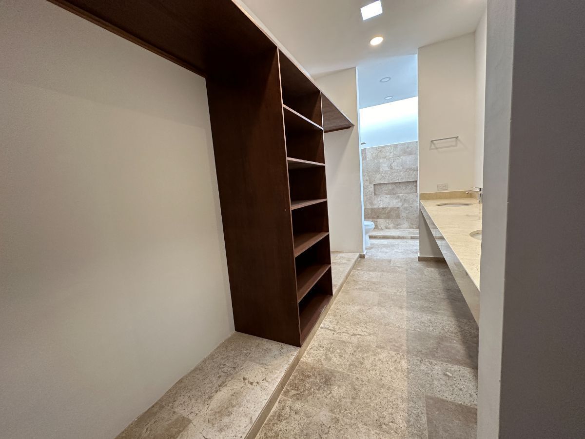 Recamara principal con área de closet vestidor, baño completo y balcón