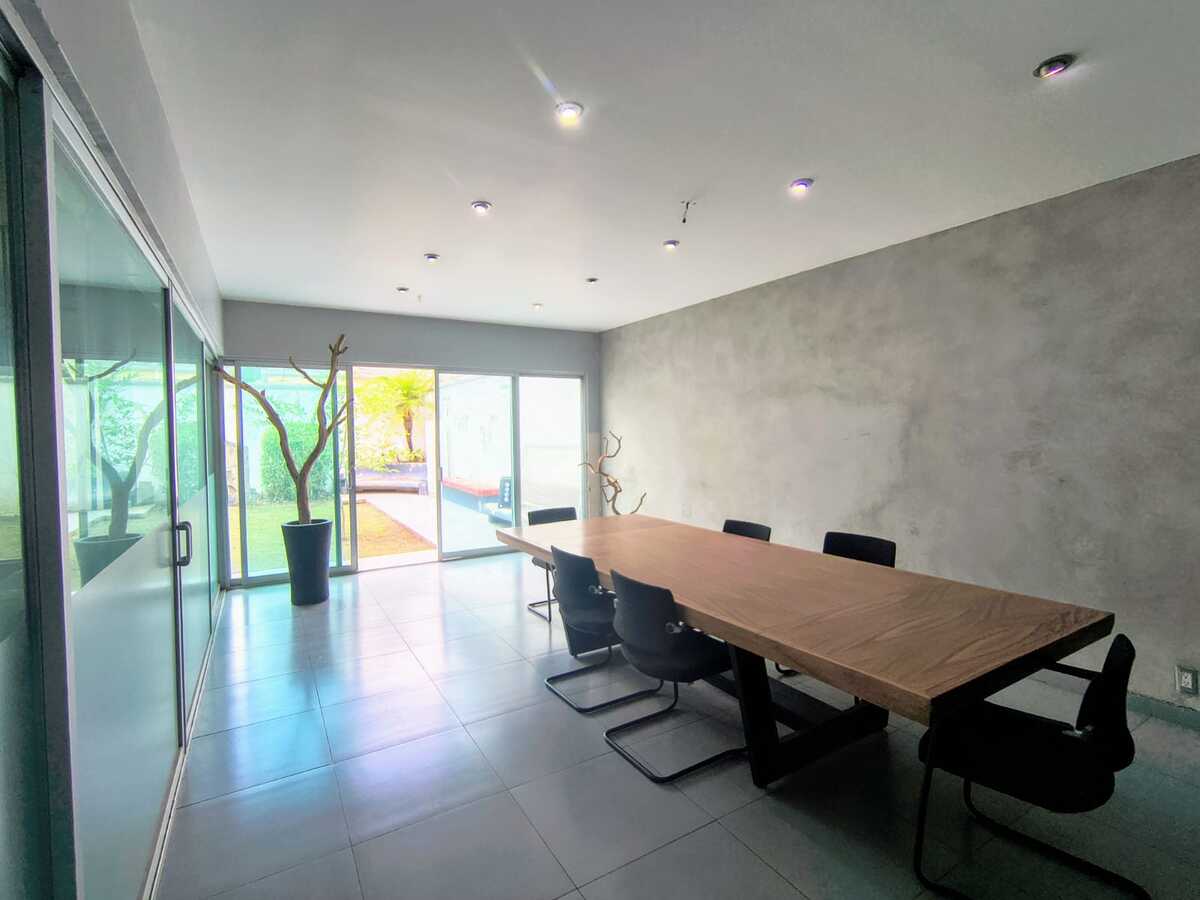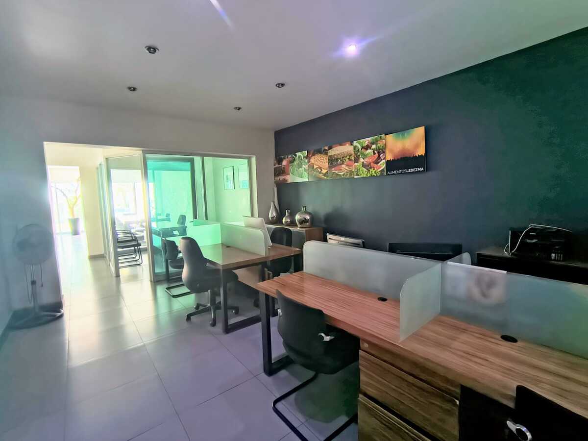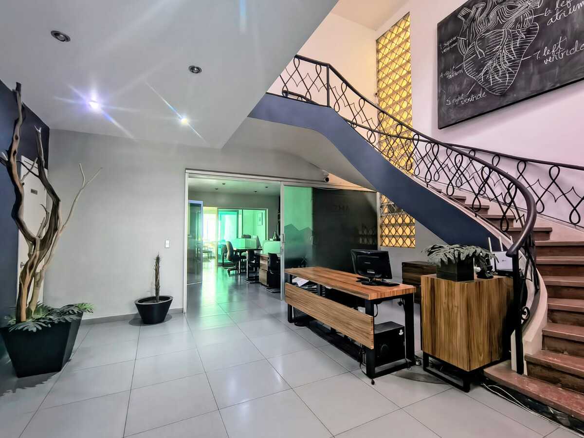 *4 estacionamientos, garage cerrado que sirve como local comercial, vestíbulo con recepción, oficina privada, sección de cubículos con oficina de cristal, sala de juntas, amplio jardín, cocina industrial, 3 medios baños.