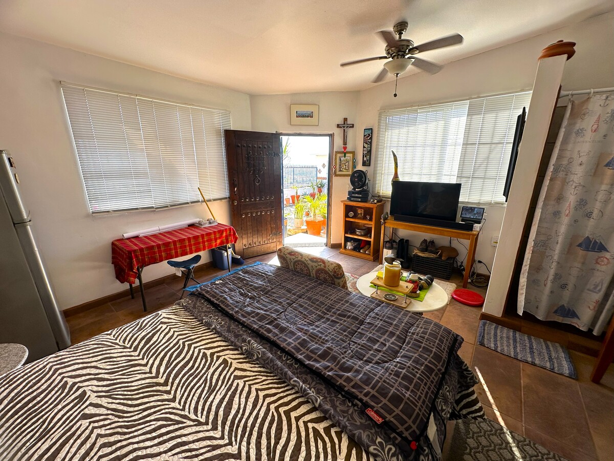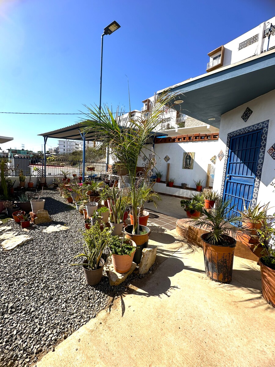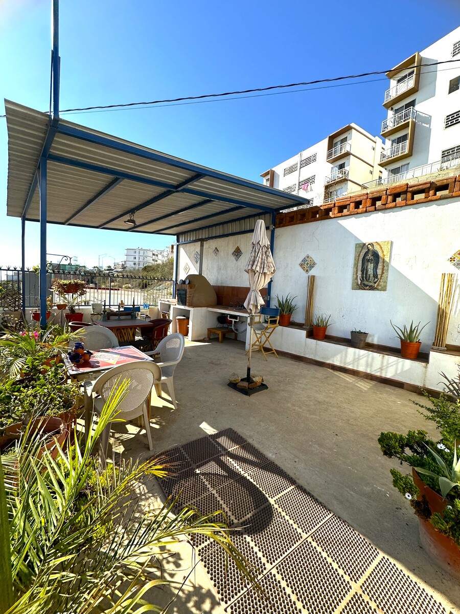 Segunda recámara con ducha independiente, baño exterior y un patio con plantas, horno de barro y área ideal para reuniones al aire libre.