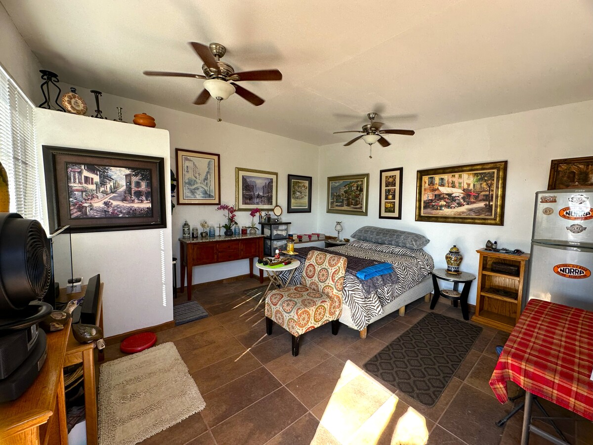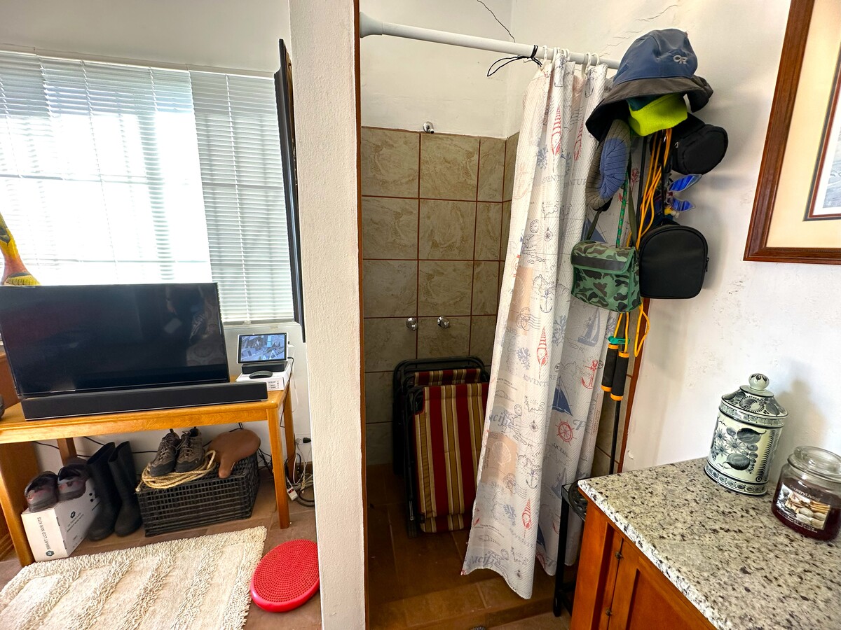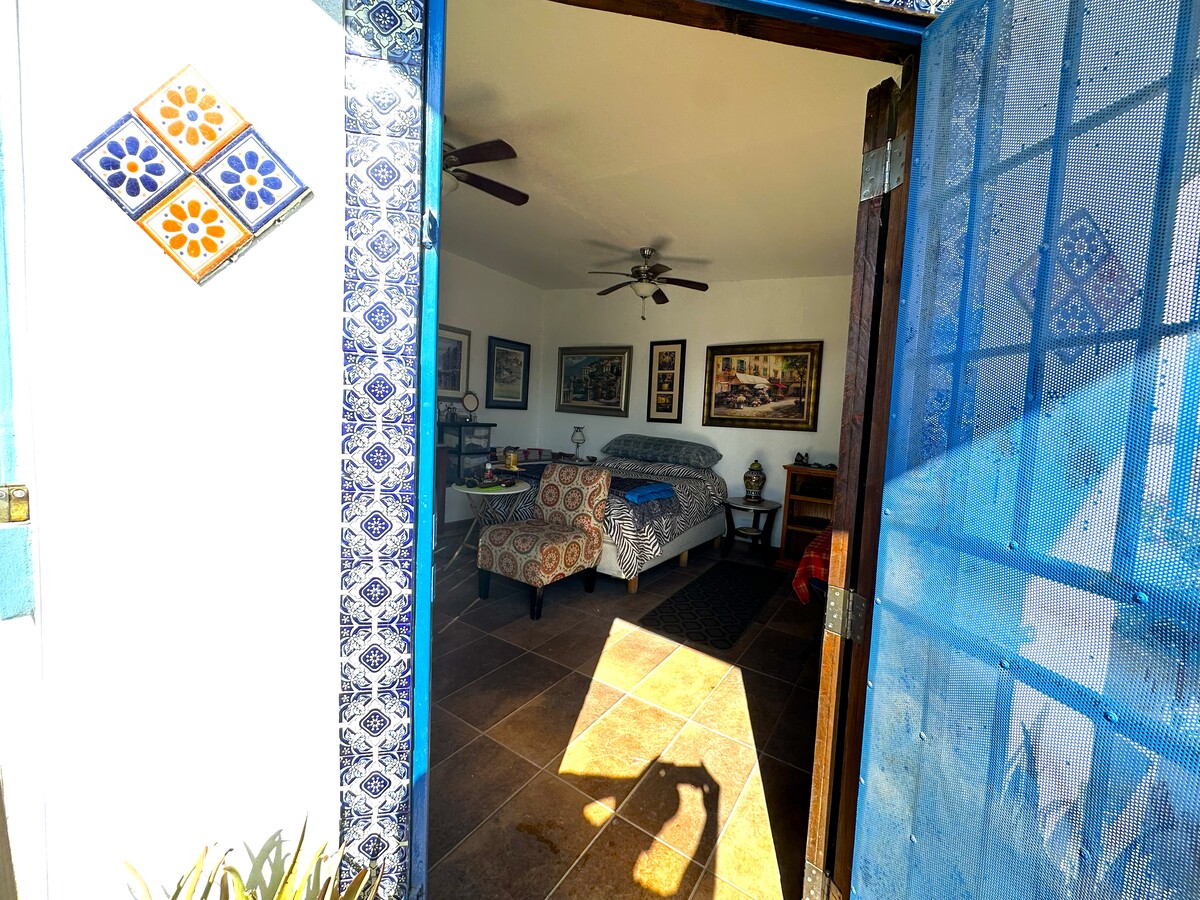 Segunda recámara con ducha independiente, baño exterior y un patio con plantas, horno de barro y área ideal para reuniones al aire libre.