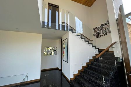 Andar superior: quarto principal com vestiário, banheiro e lareira; 2 quartos com vestiário, banheiro completo e terraço cada um; 1 quarto com vestiário e banheiro.
