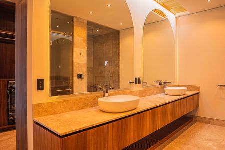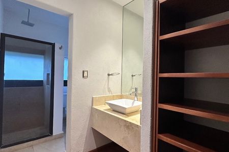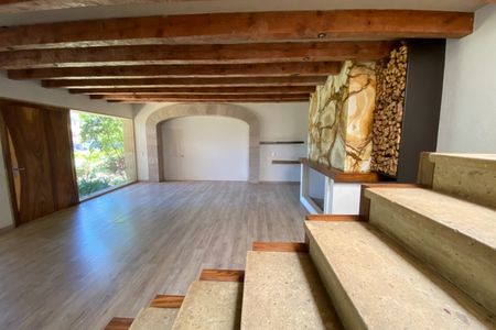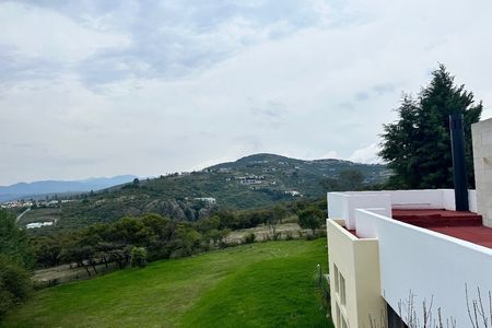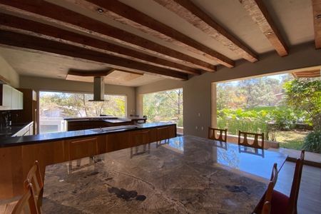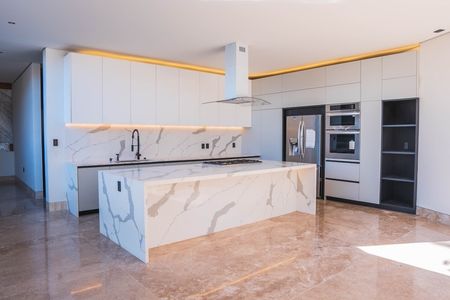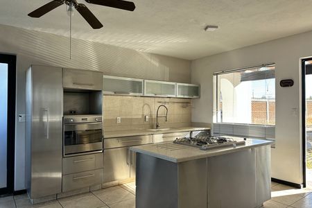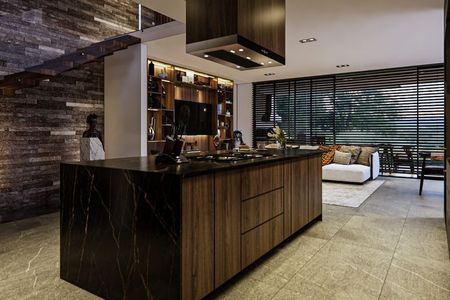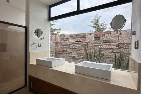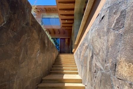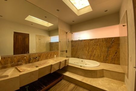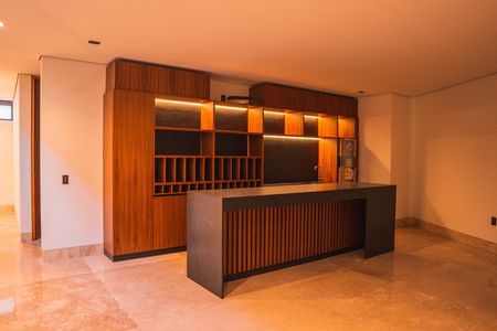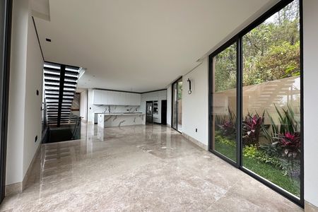Cuenta con sala, comedor con chimenea y área para bar; cocina integral con desayunador y barra de granito,lavavajillas, horno de microondas y horno de gas. Terraza central con estanque. Habitación principal con 2 vestidores y baño con jacuzzi para 2 personas, 2 habitaciones secundarias con baño y vestidor cada una, una habitación para visitas con baño completo, estudio con baño completo, sala de tv, gimnasio con baño completo y cochera techada para 3 autos.