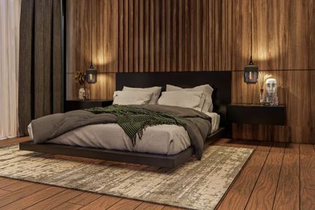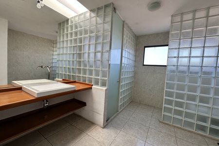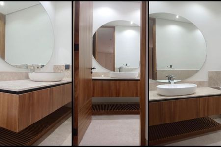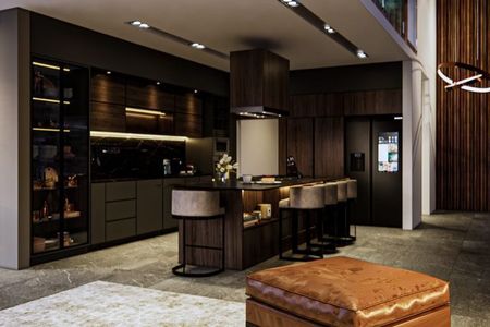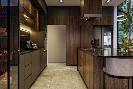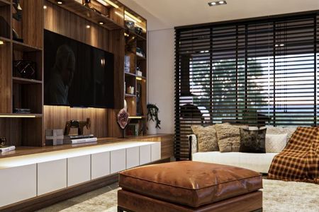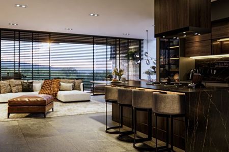 Possui sala, sala de jantar com lareira e área para bar; cozinha integrada com espaço para café da manhã e bancada de granito, lava-louças, micro-ondas e forno a gás. Terraço central com lago. Quarto principal com 2 closets e banheiro com jacuzzi para 2 pessoas, 2 quartos secundários com banheiro e closet cada um, um quarto para hóspedes com banheiro completo, escritório com banheiro completo, sala de TV, academia com banheiro completo e garagem coberta para 3 carros.