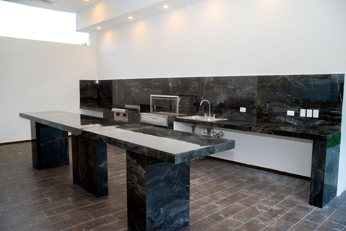 - Área social techada de 175 m² con isla forrada con porcelanato gran formato, barra con asador, tarja y estufón (todo de acero inoxidable).