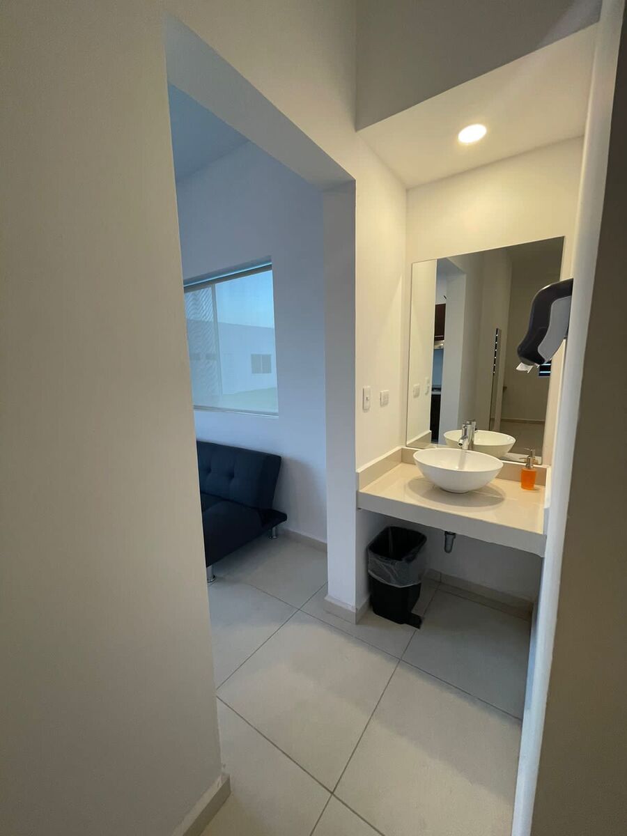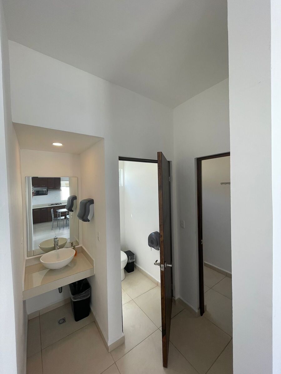 Baño de damas: 3 sanitarios con mamparas y puertas de madera, barra forrada de porcelanato con 3 ovalines y espejo grande.