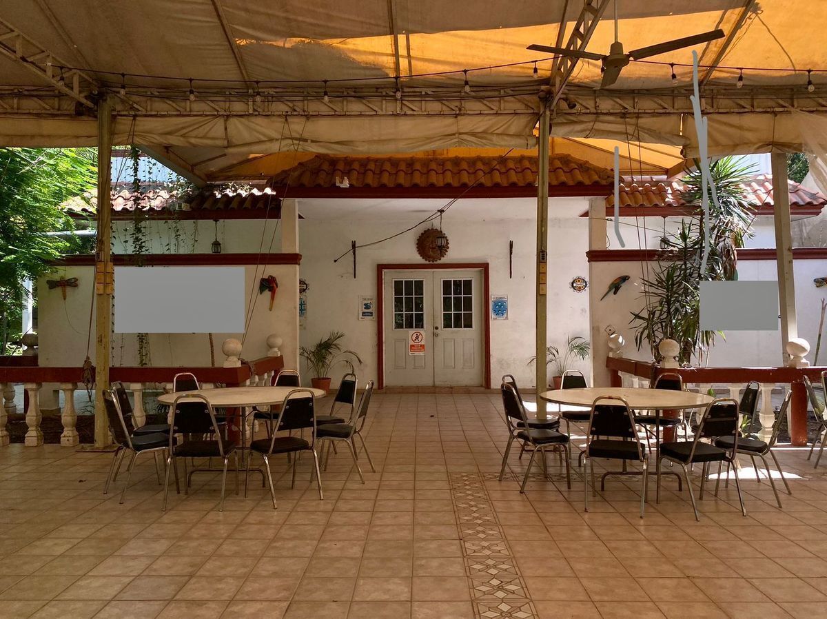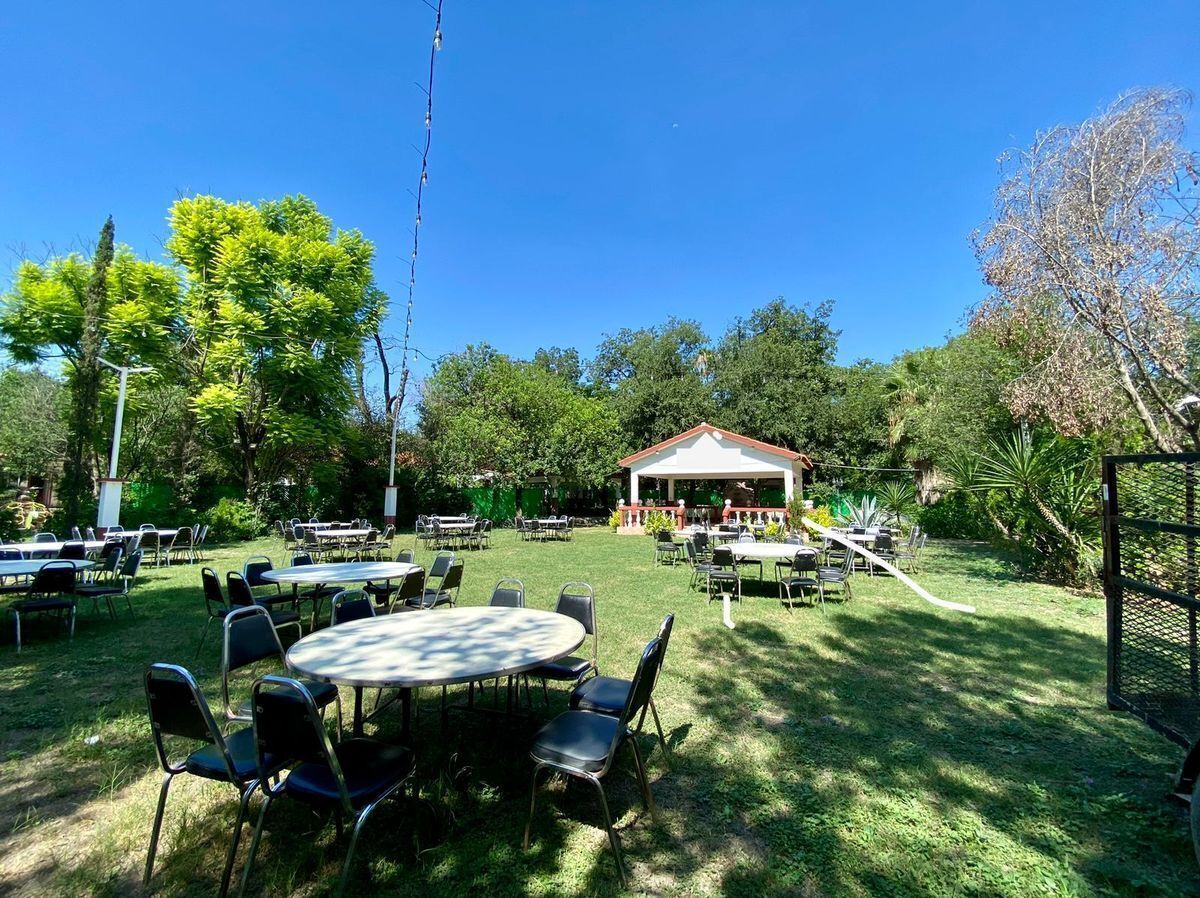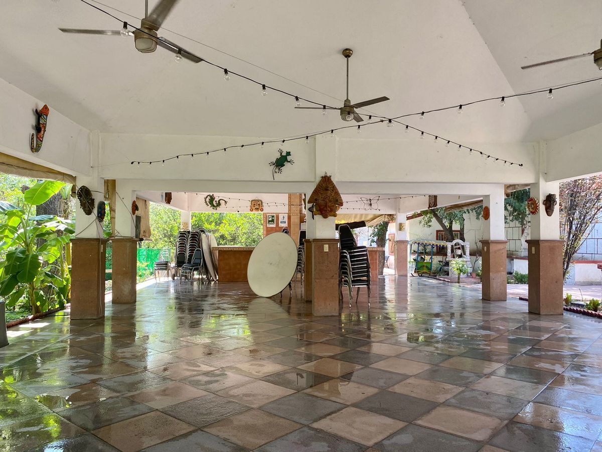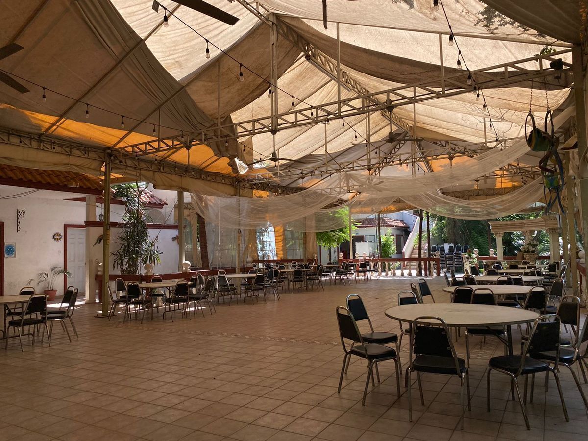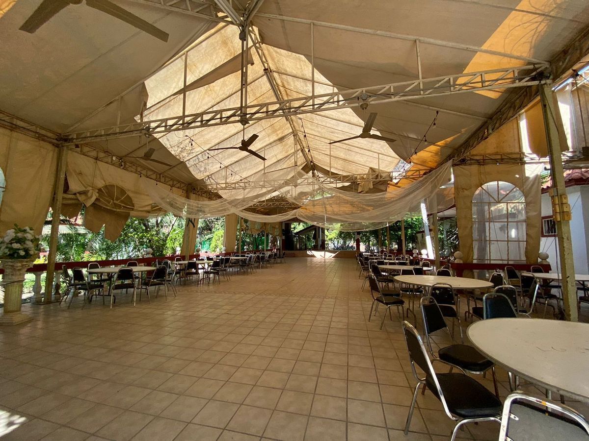 Acceso independiente, con caseta para el control de acceso, área con espacio para 600 personas, tiene dos palapas, una de ellas con equipo de luces, la otra palapa se utiliza como el centro cuando el evento se realiza al aire libre junto al jardín y donde se ubican las mesas; también cuenta con área de toldo si se requiere un evento techado, tiene baños para damas y caballeros. Hay una construcción de dos plantas, en donde la planta baja es el área de cocina, abastecimiento y distribución de alimentos; un área para el trabajador con una recámara y baño completo; así como una bodega de 45m2 con entrada por la parte trasera. En la planta alta tiene un departamento con dos recámaras, baño completo y una gran terraza con una vista inmejorable.