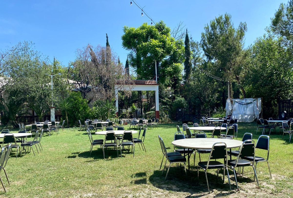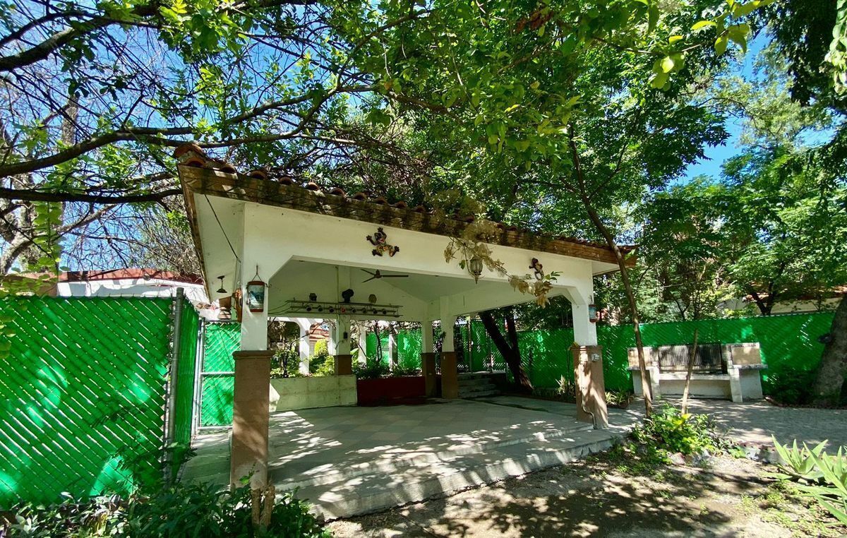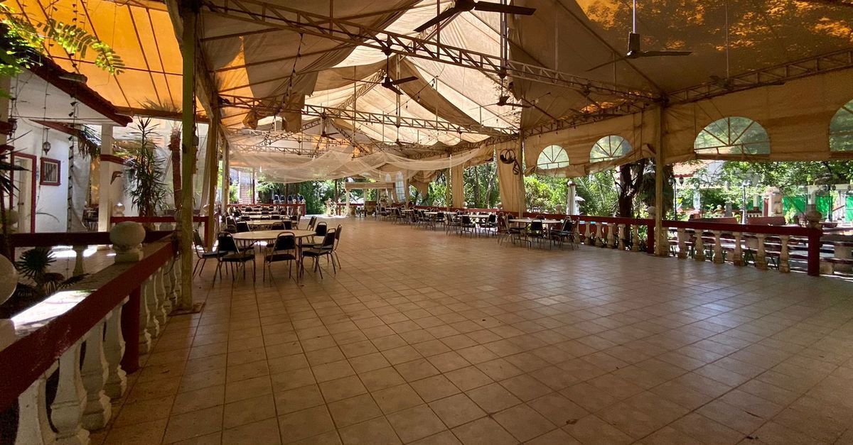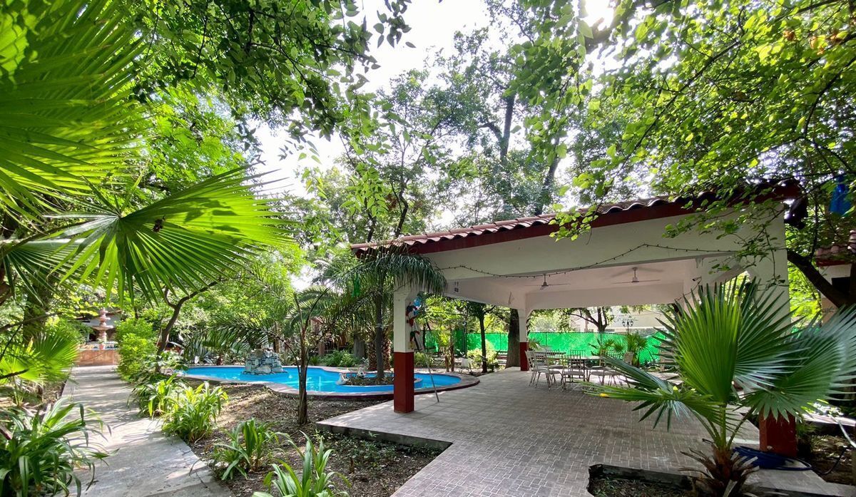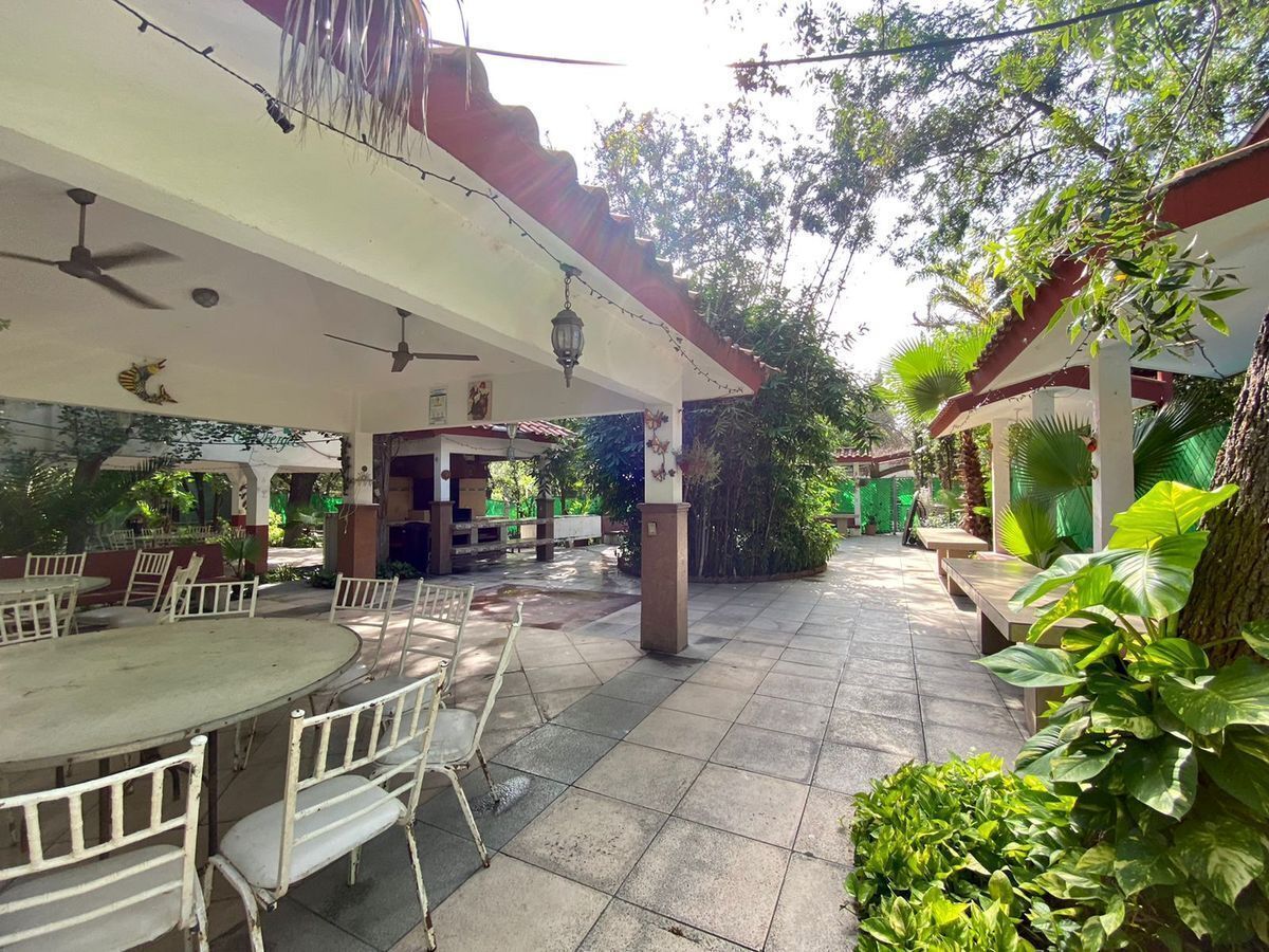 Acceso independiente, con caseta para el control de acceso, área con espacio para 600 personas, tiene dos palapas, una de ellas con equipo de luces, la otra palapa se utiliza como el centro cuando el evento se realiza al aire libre junto al jardín y donde se ubican las mesas; también cuenta con área de toldo si se requiere un evento techado, tiene baños para damas y caballeros. Hay una construcción de dos plantas, en donde la planta baja es el área de cocina, abastecimiento y distribución de alimentos; un área para el trabajador con una recámara y baño completo; así como una bodega de 45m2 con entrada por la parte trasera. En la planta alta tiene un departamento con dos recámaras, baño completo y una gran terraza con una vista inmejorable.