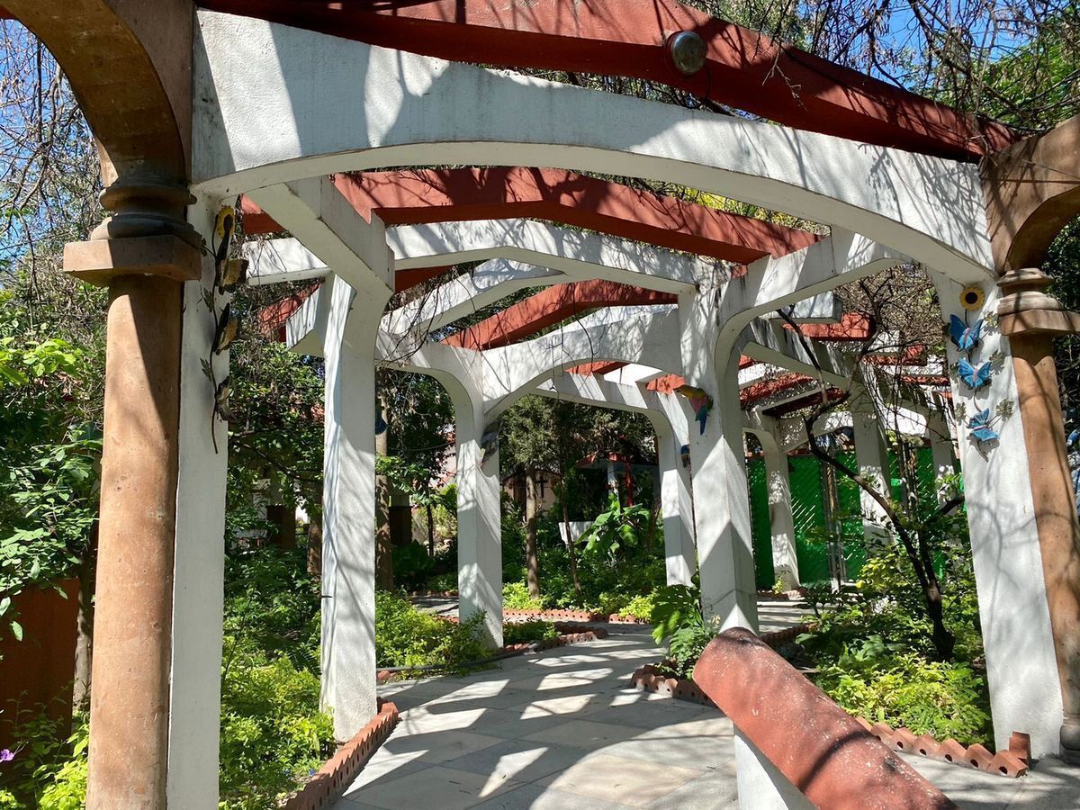 Acceso independiente, con espacio para 150 personas, tiene una palapa y alberca; cerca de los juegos infantiles y la zona de mesas junto a un pasillo ancho decorado con vigas que se cubren con enredaderas y le dan un toque romántico.