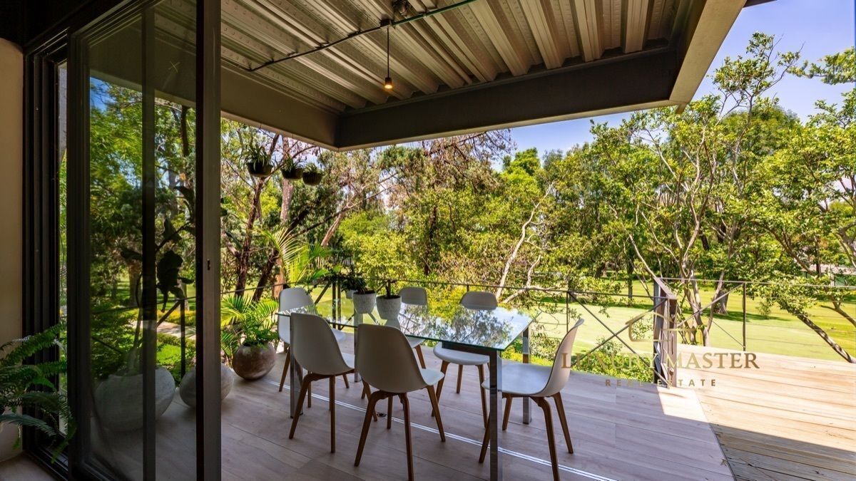 Sala Comedor en espacio abierto con chimenea, desayunador, Terraza deck de madera con vista al campo de golf, cocina integral con isla, estudio/oficina, cuarto de servicio.