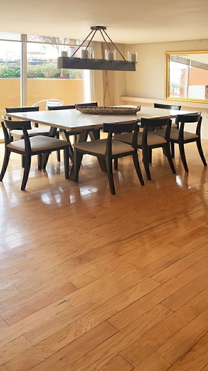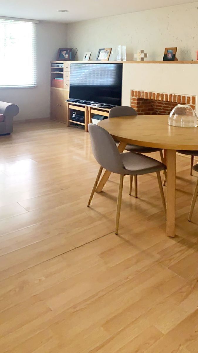 Estancia, comedor con chimenea. Cocina integral cerrada.