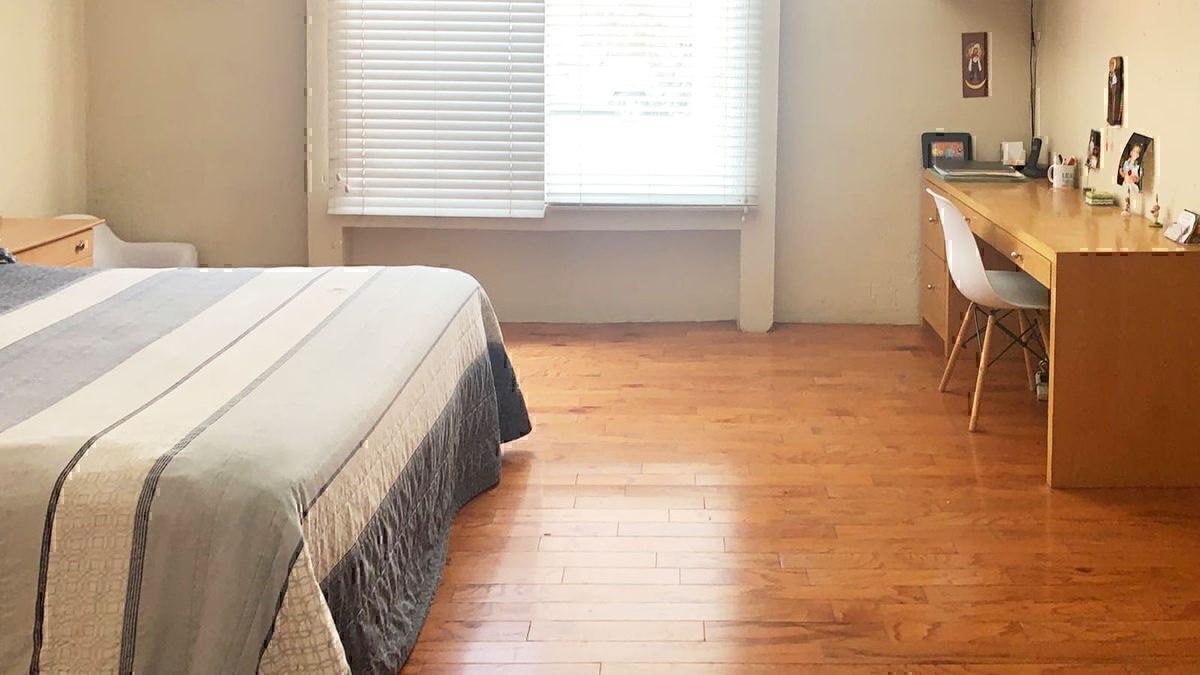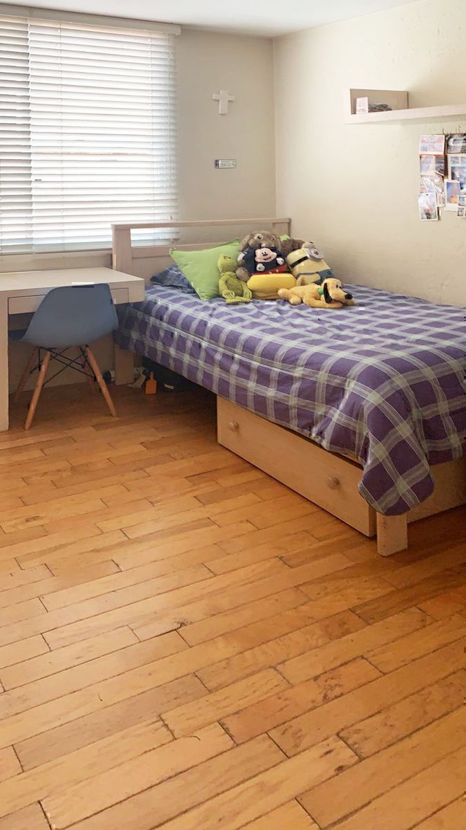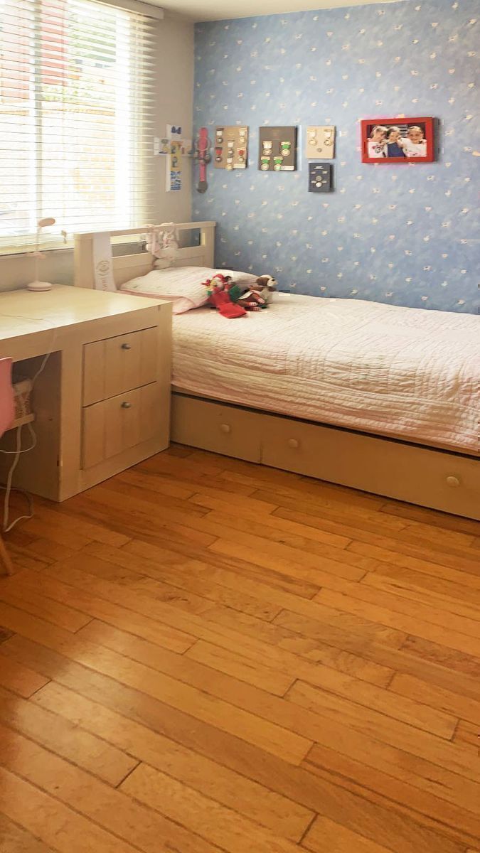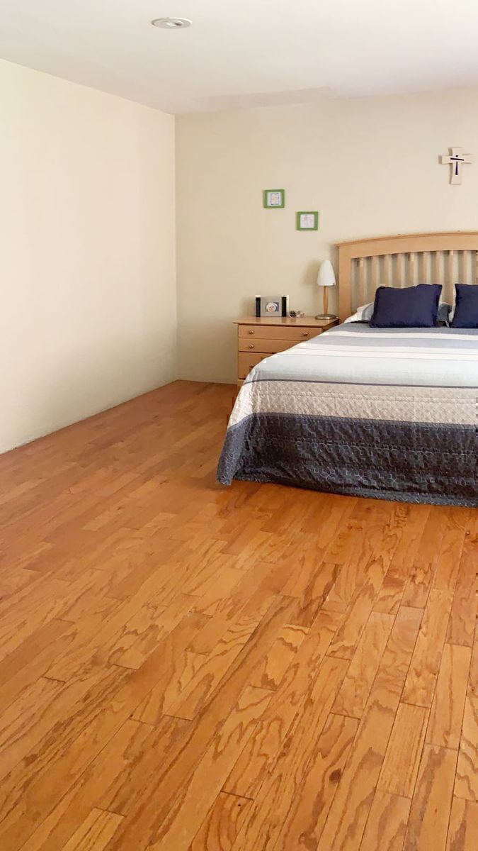 Tres recámaras en total; la principal con vestidor y baño. Dos recámaras con closet. Baño para las dos recámaras.