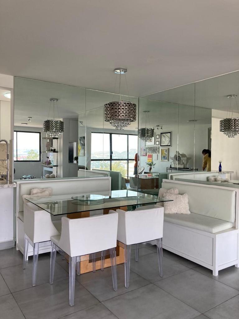 De nivel de calle bajas medio desnivel: Espectacular vista desde la estancia, comedor iluminado por ventanales de piso a techo, moderna cocina equipada con barra, recamara principal con baño y vestidor, segunda recamara con closet, tercera recamara con baño y closet, otro baño completo que da servicio a una recamara y área social.