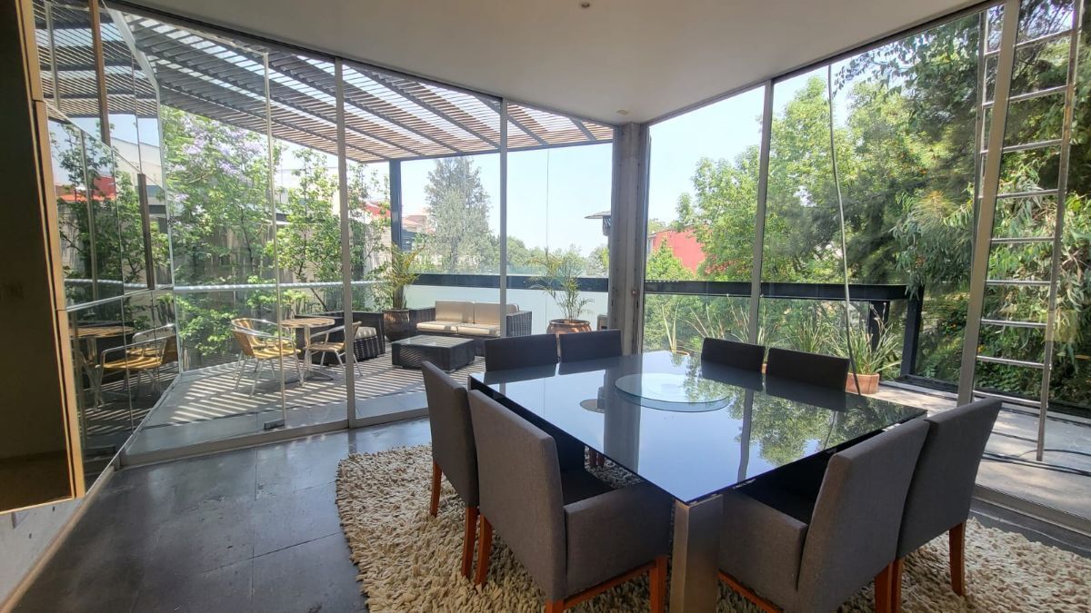 • Sala-comedor a doble altura con terraza amueblada y pérgola.