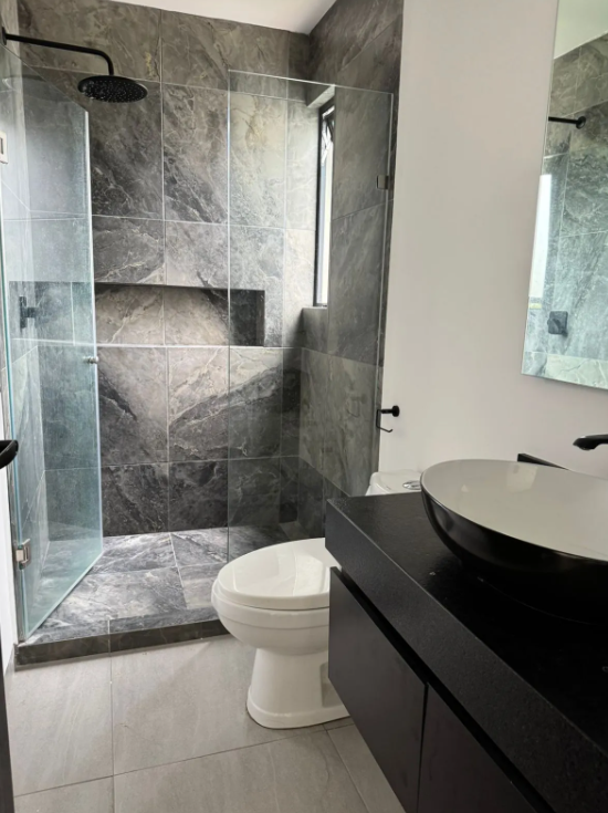 Recámara principal con aire acondicionado, vestidor y baño completo con doble lavabo
