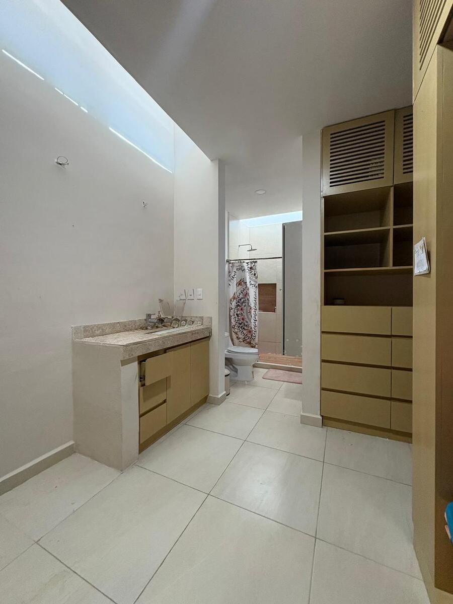 - Cozinha equipada com armários e eletrodomésticos como forno, coifa, grelha, micro-ondas)