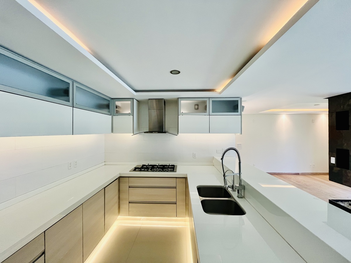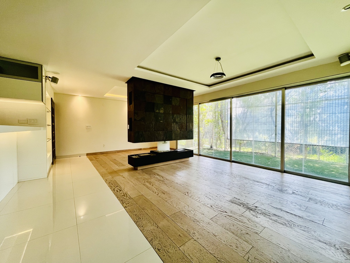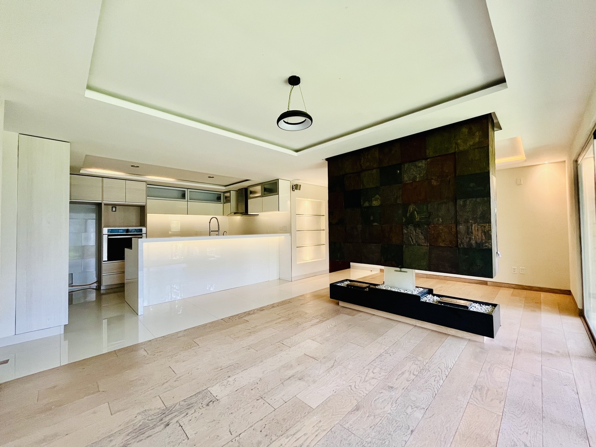 Cuenta con espacios abiertos en sala, cocina y comedor; lo que brinda una amplitud y luminosidad excepcional, hermosa chimenea que proporciona un ambiente cálido y acogedor, que también se recrea a través de las luces directas e indirectas instaladas con dimer para regular la intensidad de la iluminación.