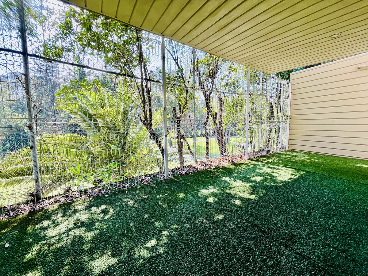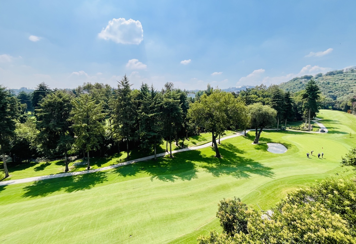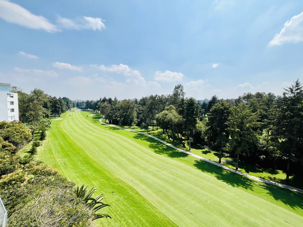 El departamento colinda directamente con el campo de golf, ofreciendo un entorno tranquilo, verde y lleno de luz natural.